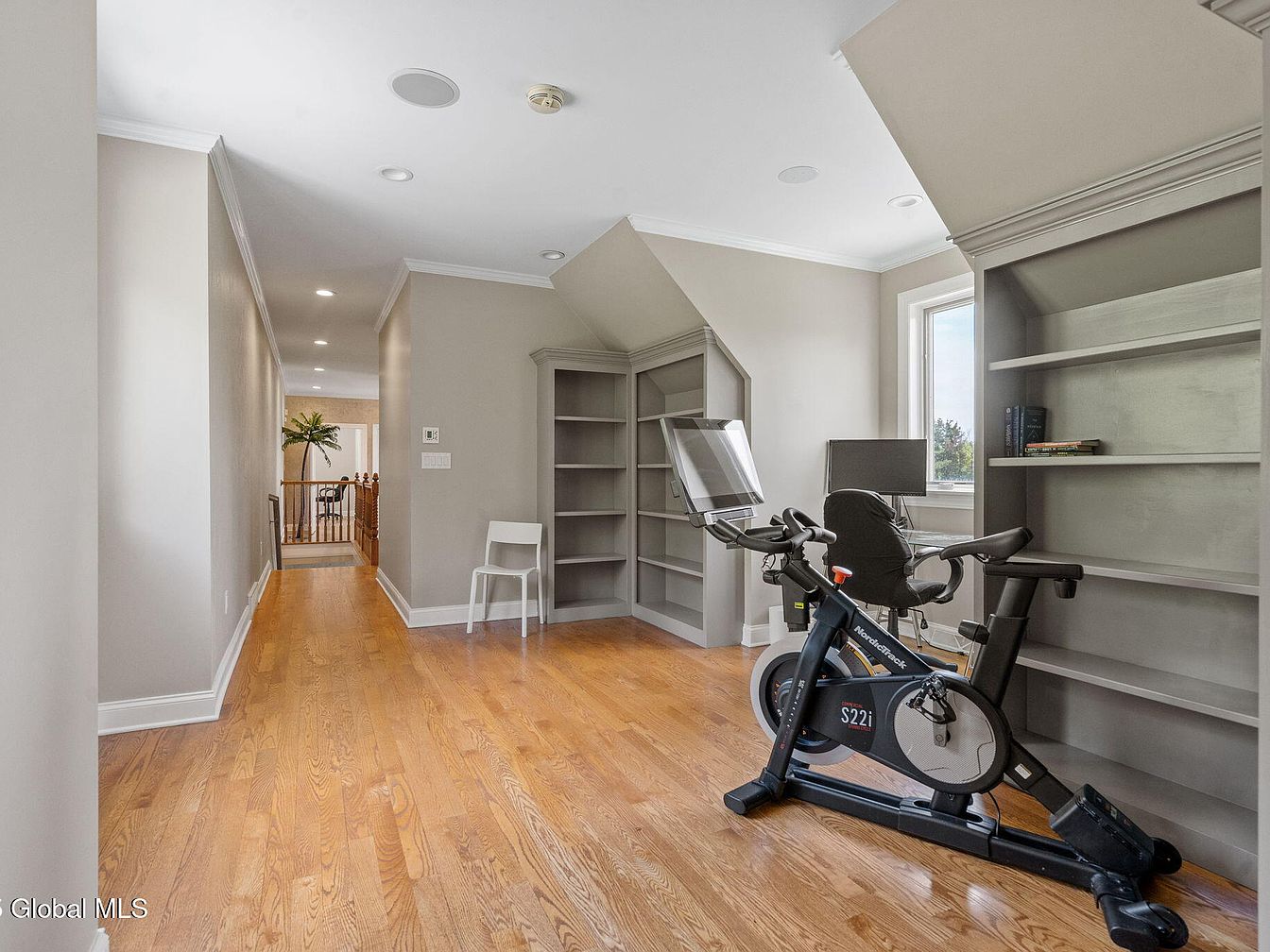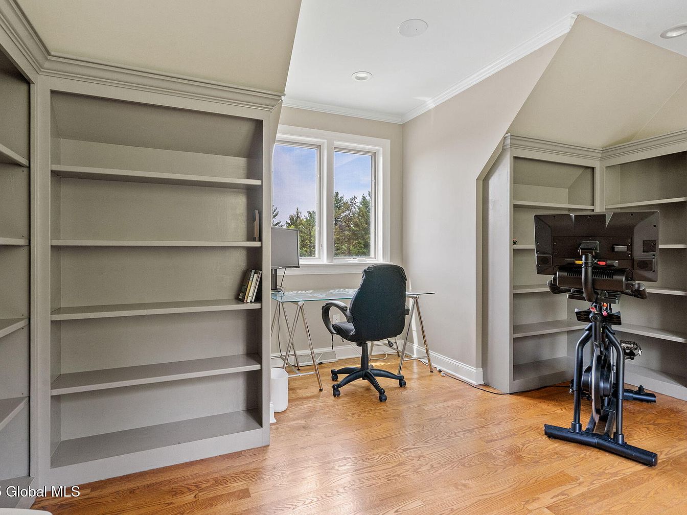 This multifunctional space blends fitness and productivity seamlessly. The layout features warm, honey-toned hardwood flooring that runs through the hallway and into the room, unifying the area with a natural elegance. A NordicTrack stationary bike is positioned to make use of a large window’s natural daylight, fostering an invigorating workout environment. Adjacent to the bike, a sleek desk and ergonomic chair create a functional office nook enhanced by built-in gray shelving units that maximize storage while accommodating the room’s sloped ceiling. Neutral beige walls and crisp white crown molding provide a calm, contemporary backdrop.