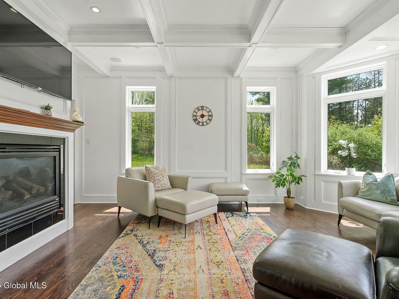 This living room exudes a bright and airy atmosphere, enhanced by the white coffered ceiling and white paneled walls that frame three vertical windows showcasing lush greenery outside. The space features a balanced blend of modern and cozy elements, including a light beige leather armchair with matching ottoman centered on a colorful, patterned area rug that adds warmth and character. Against the far wall sits a simple clock, while a small green potted plant adds a touch of nature indoors. A sleek gas fireplace with a wooden mantel hosts minimal decor, and a large mounted flat-screen TV complements the clean, contemporary styling. Dark wood flooring anchors the room, offering contrast to the predominantly light color palette.