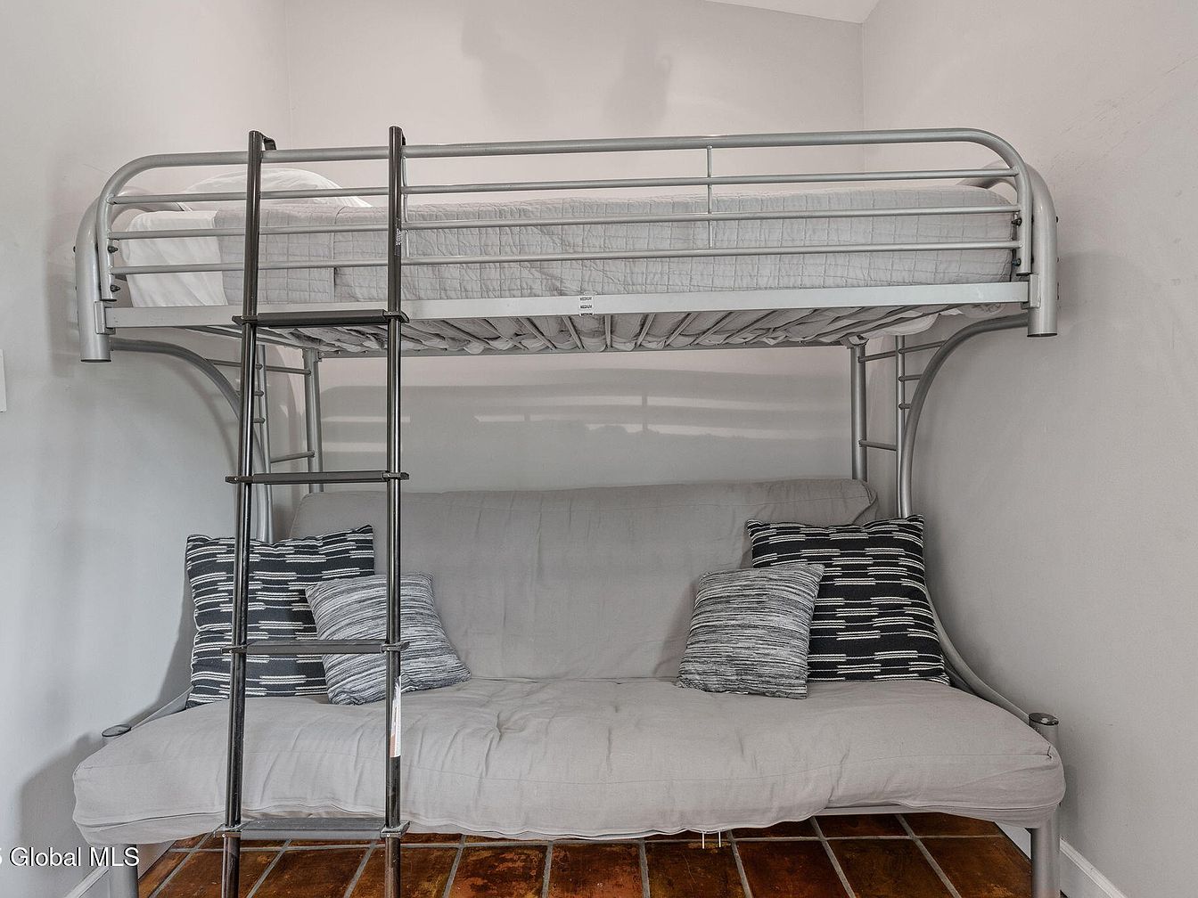 This bedroom corner features a modern metal bunk bed with a streamlined silver finish. The top bunk is dressed with a simple white quilted mattress, while the lower area combines functionality and comfort with a light gray futon-style seating. Four throw pillows in dark gray with white geometric patterns, paired with two smaller, textured lighter gray cushions, add subtle contrast. The walls are painted a soft white or pale gray, enhancing the clean, minimal look. Rustic brown tile flooring brings warmth to the space, balancing the cooler tones of the metal and fabric for a cozy, practical sleeping area.