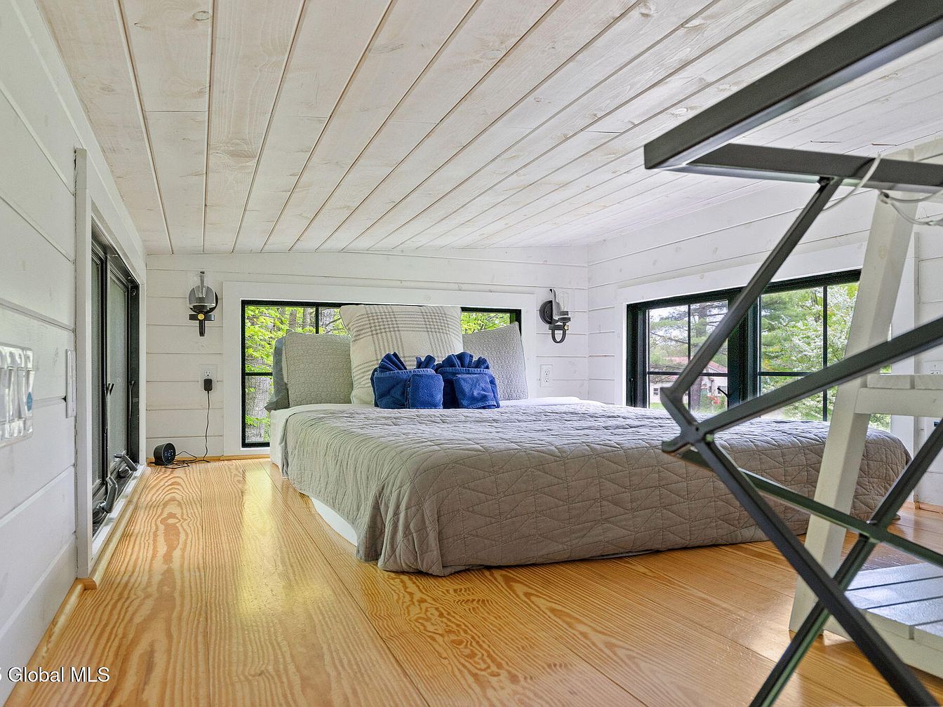 This intimate loft bedroom features a low-profile bed with a quilted grey comforter accented by decorative pillows, including two navy blue ones that add a pop of color. The walls and ceiling are clad in white-painted wooden planks, creating a bright and airy feel that contrasts beautifully with the natural light honey-toned wooden floor. Large black-trimmed windows surround the space, offering panoramic views of the lush greenery outside. Wall-mounted modern sconces provide additional lighting, and the exposed metal railing hints at the stair access to this charming elevated retreat, blending functionality with rustic-modern style.