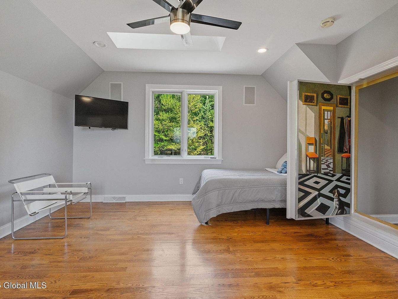 This bright, uncluttered bedroom corner features soft gray walls and warm-toned hardwood flooring. A large double window centered on the back wall lets in natural light, framing verdant outdoor greenery. Below the vaulted ceiling is a modern ceiling fan with integrated lighting, enhancing comfort. A wall-mounted TV faces the spacious area, while a minimalist, white metal-framed chair adds a sleek seating option. One side reveals a neatly made bed with gray bedding, accompanied by a dramatic painted door that artistically depicts an interior scene with checkerboard floors, adding a creative focal point to the serene space.