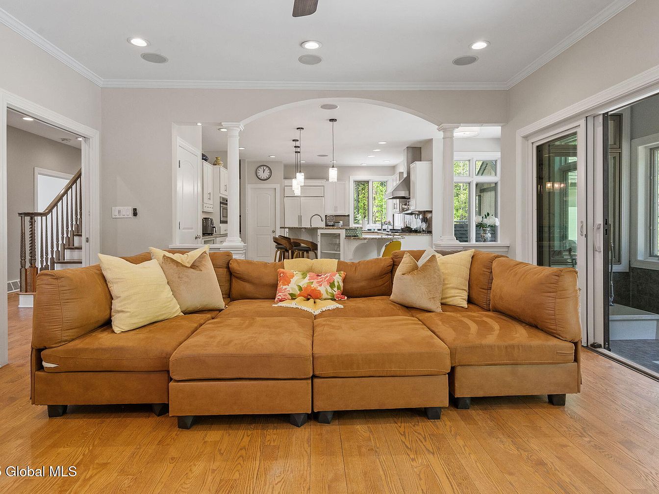 This inviting living room features a large sectional sofa in a warm caramel tone, adorned with soft pillows in pastel yellow, beige, and a floral central accent. The hardwood floor adds warmth, seamlessly continuing into the kitchen area visible beyond a wide archway supported by classic white columns. The kitchen boasts white cabinetry and modern stainless steel appliances, complemented by a breakfast bar with wooden stools. Recessed ceiling lights and pendant fixtures provide ample illumination. Neutral walls and clean lines emphasize the open-concept layout, blending comfort with elegant architectural details and natural sunlight streaming through tall windows.