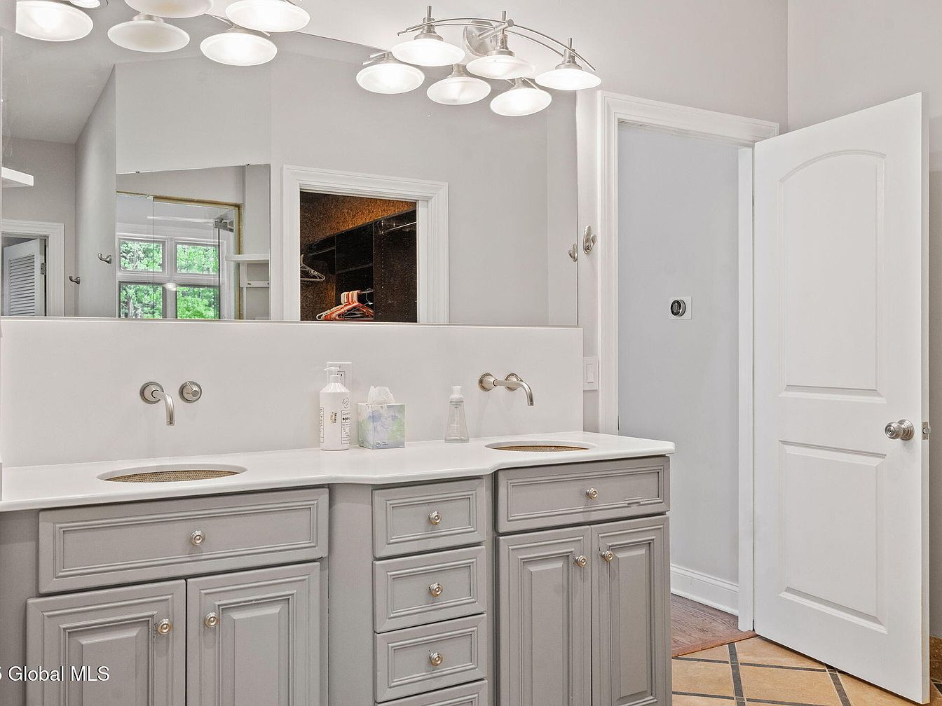 This bathroom features a large double vanity with a clean, contemporary design, offering ample storage through its numerous soft gray drawers and cabinets. The countertop is sleek and white with subtle integrated sinks and minimalist brushed nickel faucets mounted on the backsplash. Above the vanity is an expansive mirror that visually enlarges the space while reflecting natural light from the adjacent window. The walls are painted a light gray, enhancing the bright and airy atmosphere. Decorative ceiling lighting fixtures provide modern illumination, complementing the overall neutral color scheme. A white paneled door leads into an adjoining room.