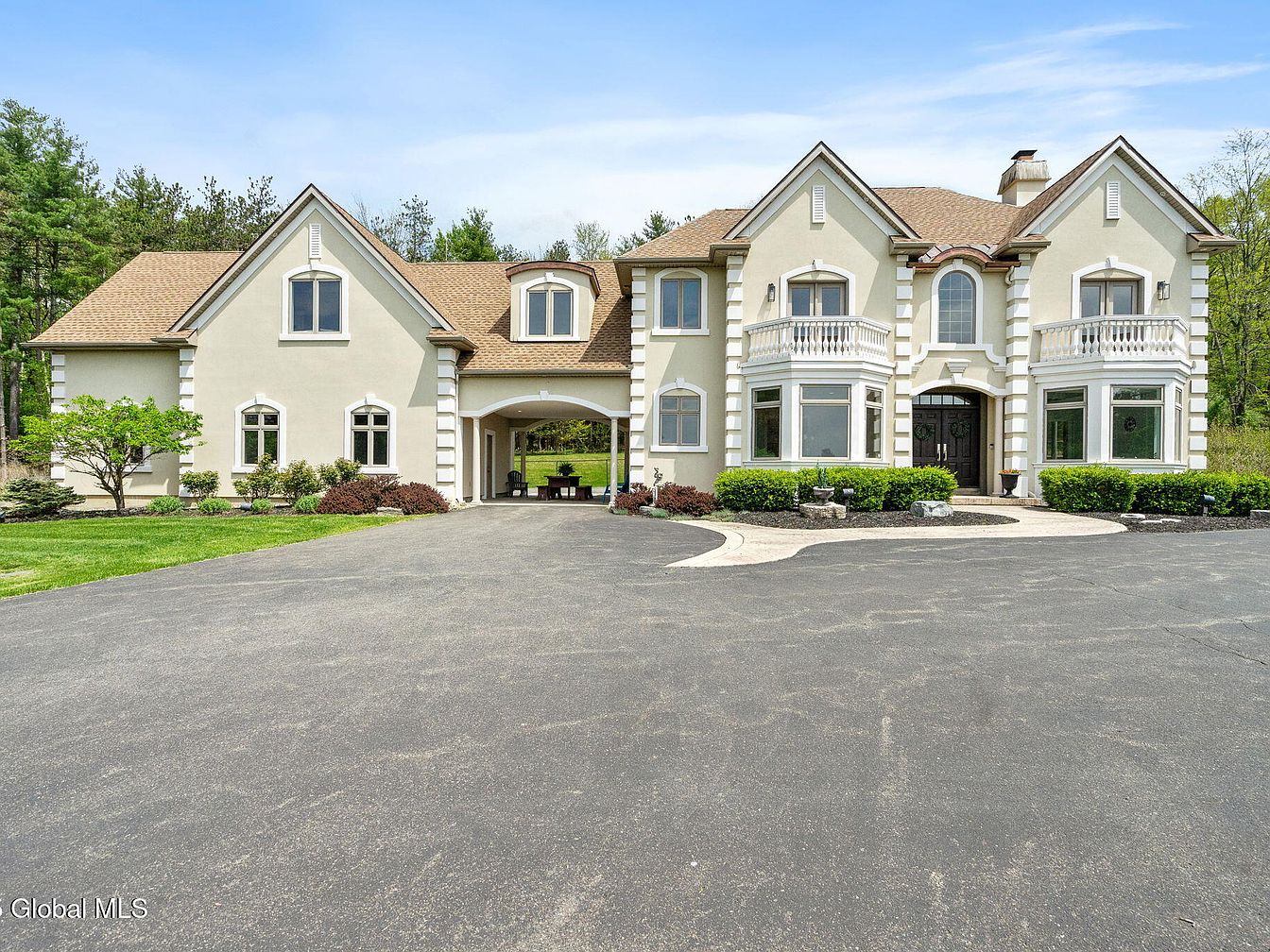 This impressive estate located in Nassau, NY, epitomizes luxury and privacy set on a sprawling 134-acre plot. The architectural style showcases a grand, classic design with elegant details such as arched windows, multiple balconies with balustrades, and a soft stucco exterior complemented by a tan shingle roof. The property was built to offer both comfort and opulence, featuring a main home with an open layout that includes a gourmet kitchen, radiant heated floors, a wine cellar, theater room, and multiple fireplaces. Unique additions like 4 stocked ponds, extensive trails for outdoor enjoyment, a saltwater pool, multiple barns, and two waterfront tiny homes add further appeal. The asking price for this exceptional estate is $2,250,000.