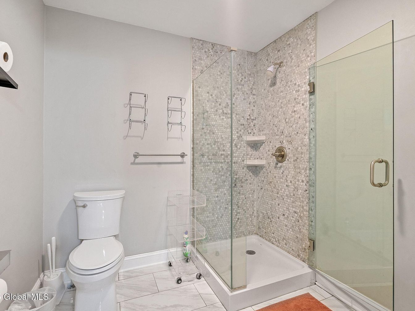 This bathroom features a clean, modern design with a neutral color palette dominated by soft gray walls and white accents. The shower area is enclosed by clear glass panels with sleek, brushed metal fixtures, creating a spacious and airy feel. The shower walls are clad in hexagonal pebble mosaic tiles that add subtle texture and natural visual interest. Adjacent to the shower is a simple white toilet with chrome hardware. The flooring is large-format white tiles with faint gray veining, enhancing the contemporary aesthetic. Minimal accessories, including a towel bar and small rolling storage, complete the functional space.