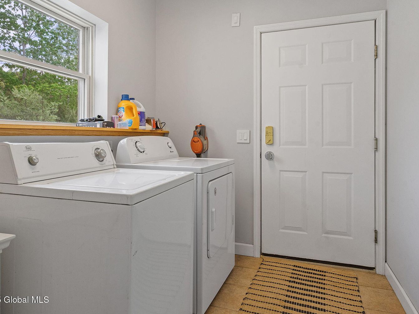 This laundry area features a clean and practical design, with a white washer and dryer placed side by side beneath a large window that brings in ample natural light. The walls are painted in a soft, neutral tone that complements the light wooden window ledge, creating a warm contrast. The door adjacent to the appliances likely leads to the exterior or a garage, characterized by its classic paneled design and white finish. A striped beige and black rug adds subtle texture and warmth to the light tiled floor. The space is neatly organized with laundry essentials on the window shelf and a handheld vacuum mounted on the wall.