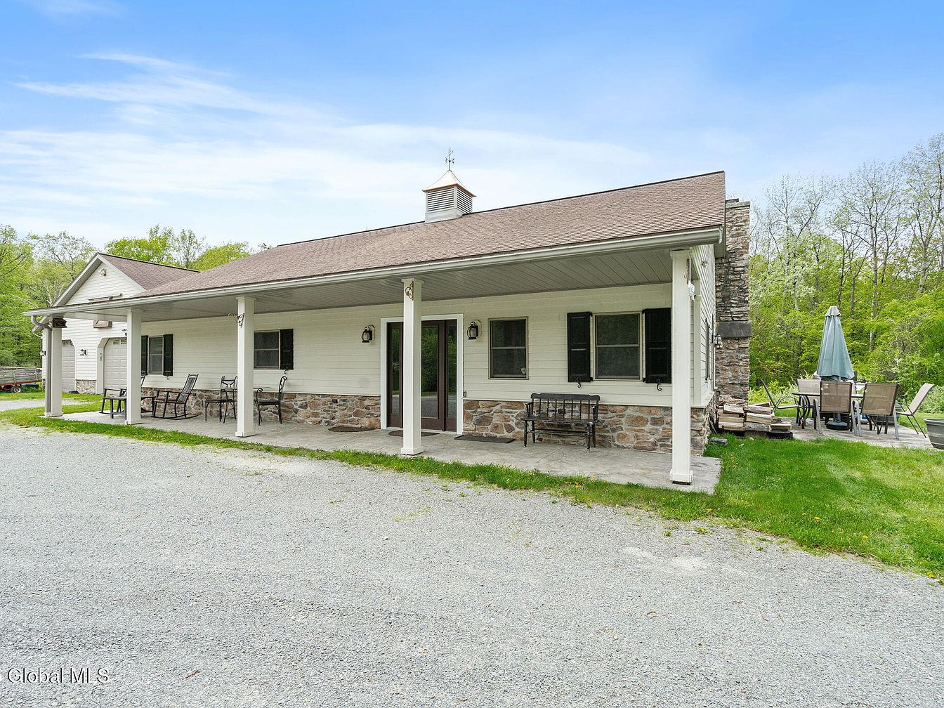 This inviting front porch features a classic country aesthetic with stone accents at the base of the cream-colored siding and striking black shutters framing the windows. Supported by sturdy white columns, the wide covered porch offers ample space for several metal chairs and benches, making it perfect for relaxing or social gatherings. The brown shingled roof complements the neutral palette, while vintage-style wall lanterns add charm and a welcoming touch. Adjacent to the porch is a gravel driveway, leading to a side outdoor patio area with a dining table, umbrella, and natural greenery surrounding the home, emphasizing a serene, rustic atmosphere.