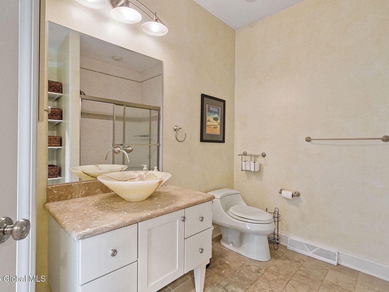This bathroom features a clean and elegant design with neutral beige walls and light-toned marble flooring. The vanity showcases a unique, vessel-style sink made of translucent stone, paired with a sleek, wall-mounted faucet over a marbled countertop. The white cabinet below offers storage with simple silver knobs, lending a minimalist yet refined feel. A large mirror stretches horizontally, enhancing the sense of space and reflecting a modern shower enclosure with sliding glass doors. Contemporary light fixtures above the mirror provide ample brightness. The toilet area is spacious, with silver-toned accessories including towel racks and a small artwork that adds a subtle pop of color.
