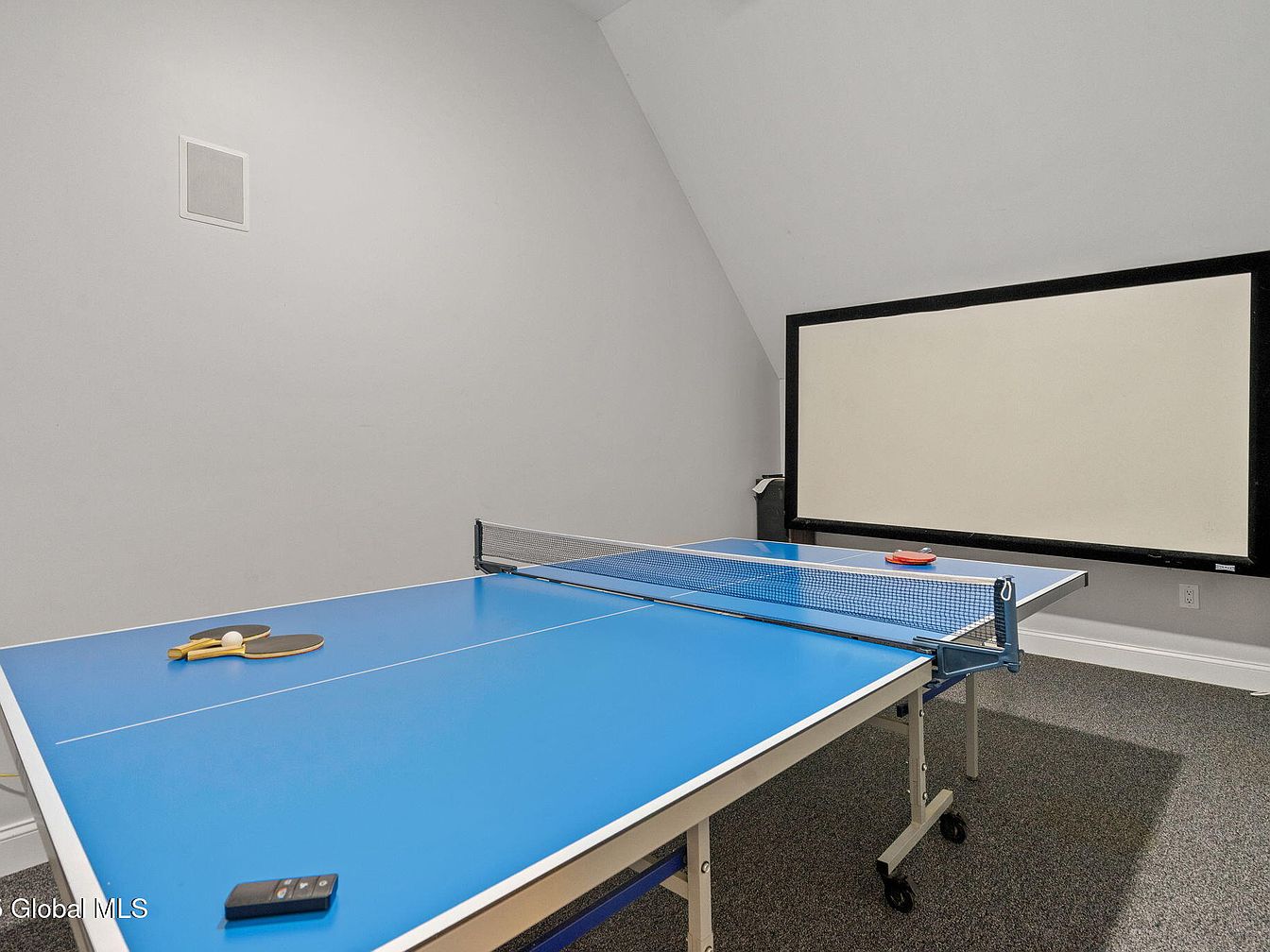 This room offers a cozy recreational space designed for entertainment. The vibrant blue ping pong table dominates the center, complemented by two paddles and a ball resting on its surface. Positioned against a light gray wall is a large projection screen framed in black, ideal for movie nights or gaming. The carpeted floor in a neutral tone adds warmth, while the sloped ceiling adds architectural interest. Minimalist in décor, this space combines functionality with casual comfort, creating an inviting atmosphere for game playing and multimedia enjoyment.