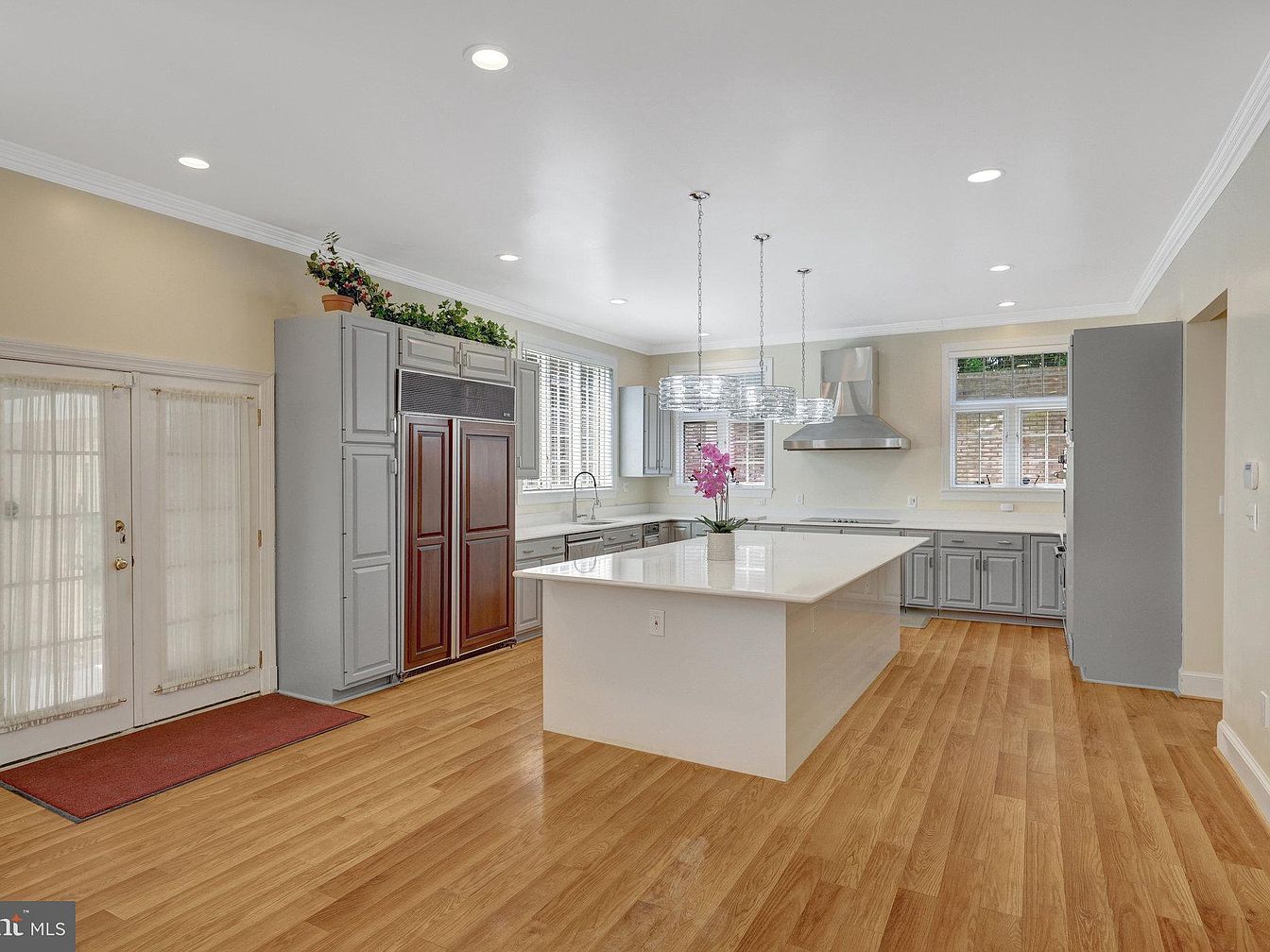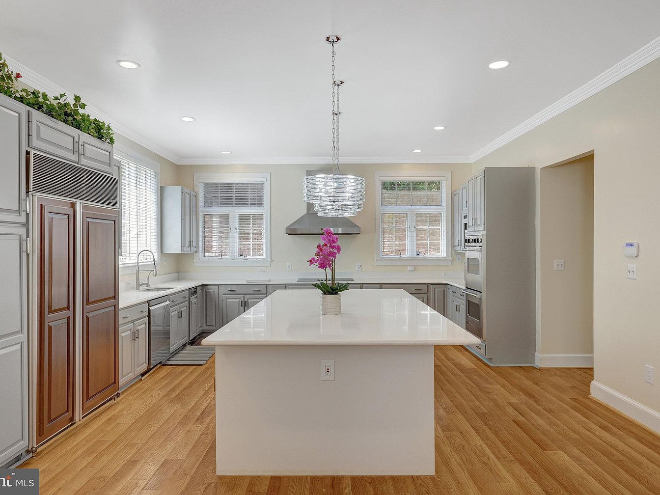 This spacious kitchen features a large, sleek white island at its center, providing ample workspace and accentuated by three elegant pendant lights with clear glass shades. The surrounding cabinetry is painted a subtle gray, contrasting beautifully with the rich dark wood refrigerator panels. Warm, light-toned wood flooring runs throughout, creating a welcoming foundation. Stainless steel appliances and a modern range hood add a polished, contemporary feel. Natural light filters in through multiple windows with white blinds, enhancing the neutral beige walls and white trim. A touch of greenery atop the cabinetry adds freshness to this clean, open-concept kitchen.