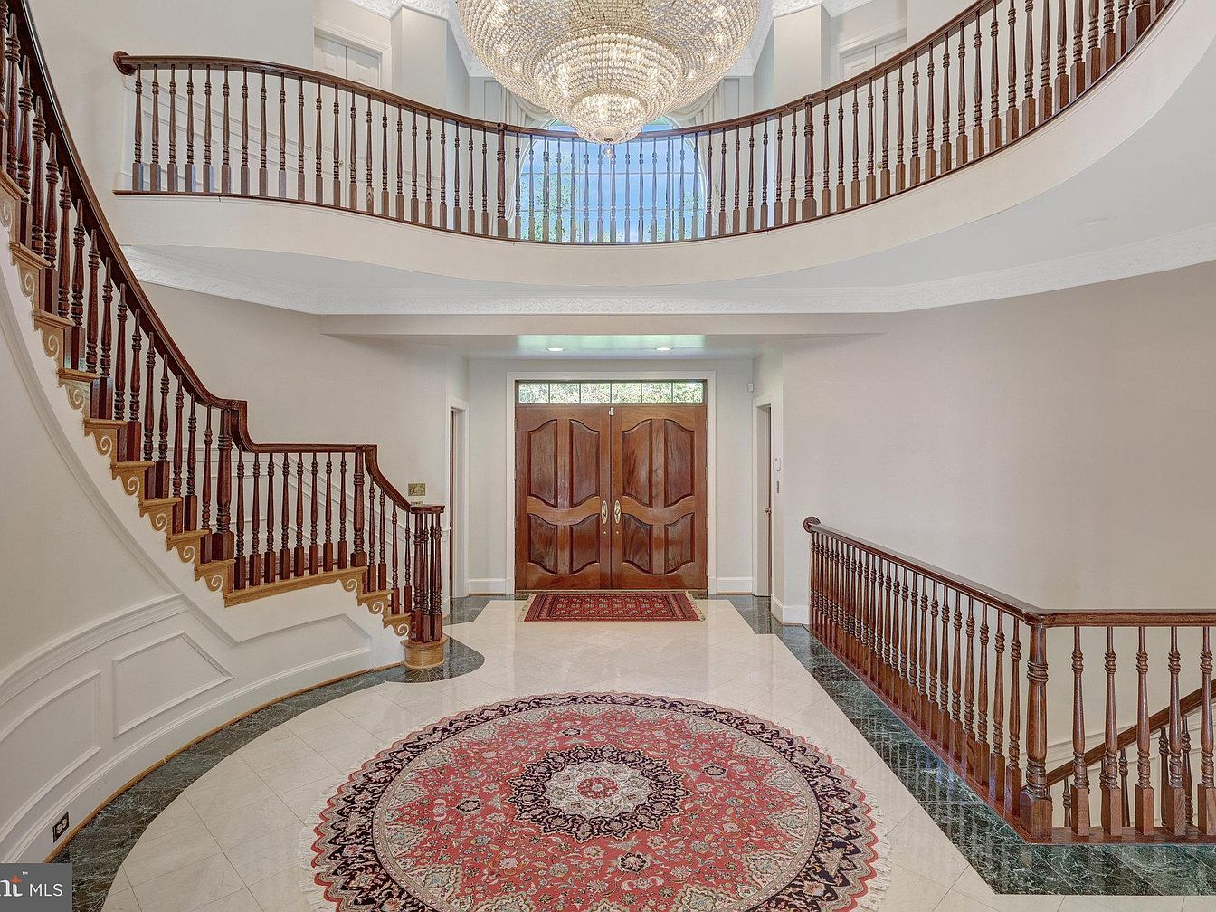 The foyer welcomes with an impressive double-height ceiling and a large, stunning crystal chandelier as its centerpiece. A grand curved staircase with elegant dark wood balusters and handrails wraps around the entry space, creating a sense of flow and openness. The double front doors are crafted from rich wood with intricate panel detailing, complemented by a transom window above that allows natural light to filter in. The flooring is a polished marble tile bordered with a deep green marble trim, anchoring a beautiful, round oriental rug in reds and neutrals that adds warmth and character to the space. Neutral wall tones and classic molding details complete the sophisticated, timeless aesthetic.