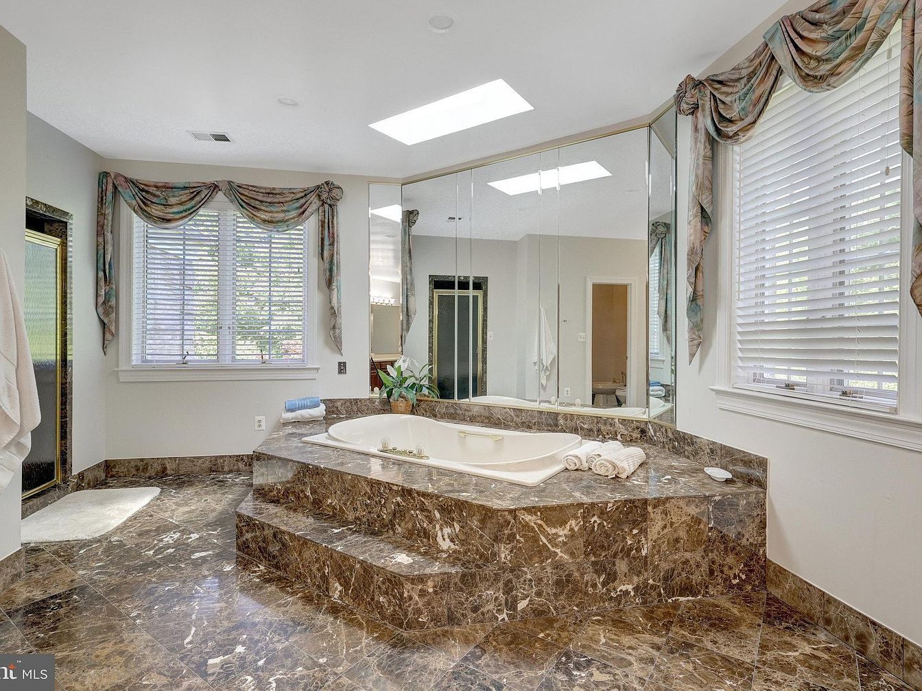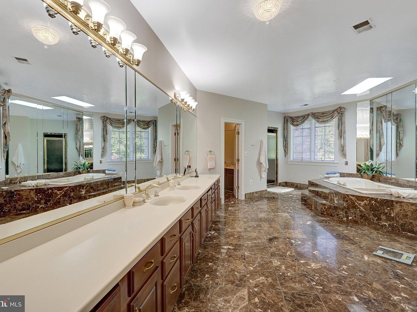 This spacious master bathroom features a luxurious layout with a long dual-sink vanity topped with a clean, light-colored countertop and rich wooden cabinetry. The wall behind the sinks is adorned with a large mirror extending to the ceiling, enhancing the room’s brightness and expansiveness. Warm marble flooring and matching marble surrounds on the built-in bathtub contribute to a sophisticated ambiance. The tub area is complemented by a large window draped with elegant swag curtains, allowing natural light to filter in softly. Recessed ceiling lighting and a skylight add a modern touch, while gold-tone fixtures provide a classic finish.