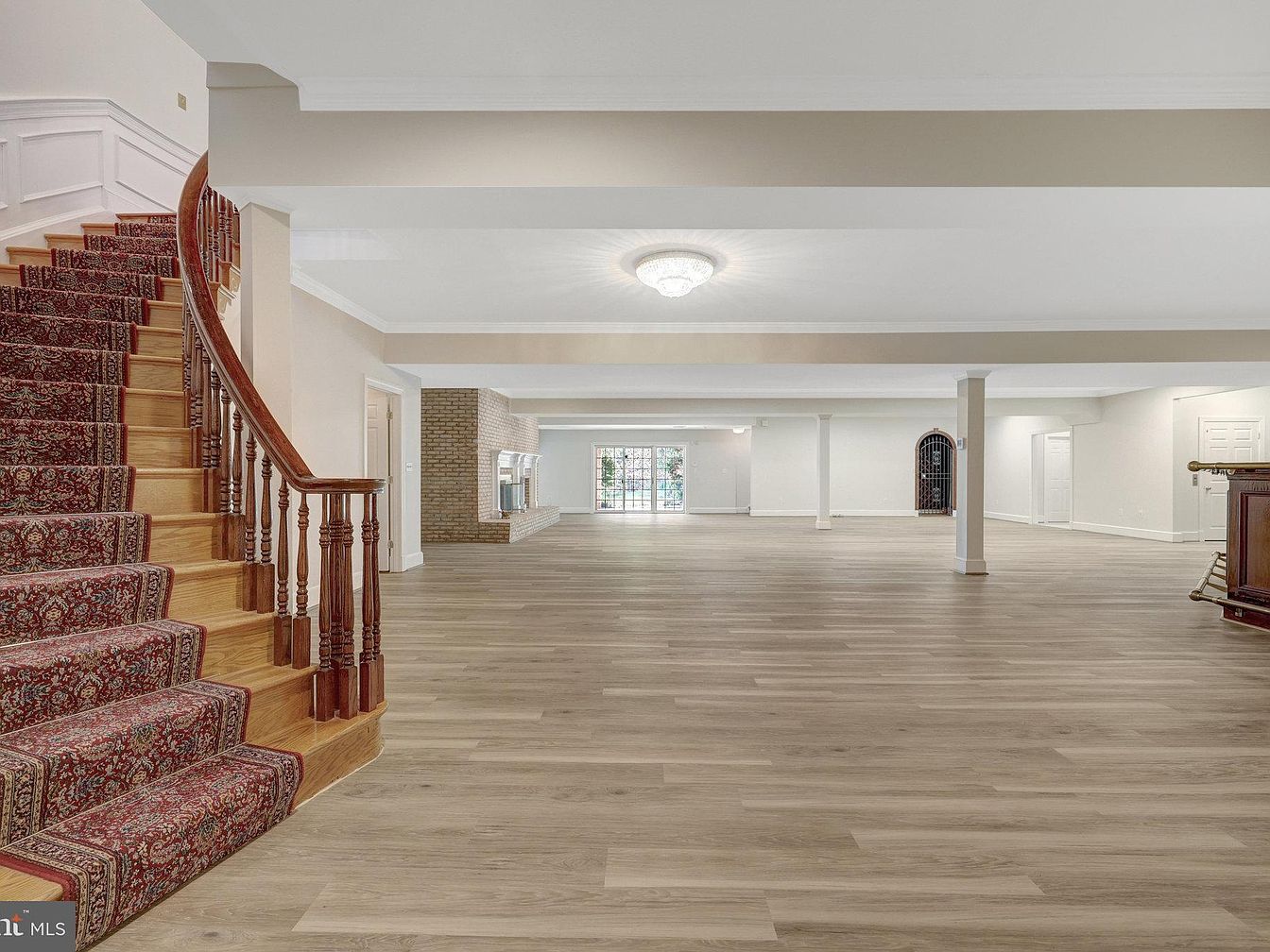 This expansive basement living area features an open floor plan with light wood-look flooring that extends throughout the space, creating a warm and inviting atmosphere. The ceiling is painted white with modern recessed lighting, and a decorative crystal ceiling fixture adds a touch of elegance. A beautifully crafted curved wooden staircase with intricately turned balusters and a patterned runner carpet introduces traditional charm. The far wall hosts a double-sided brick fireplace with a raised hearth, serving as a central architectural focal point. Multiple doorways and large windows allow natural light to brighten the neutral-toned room.