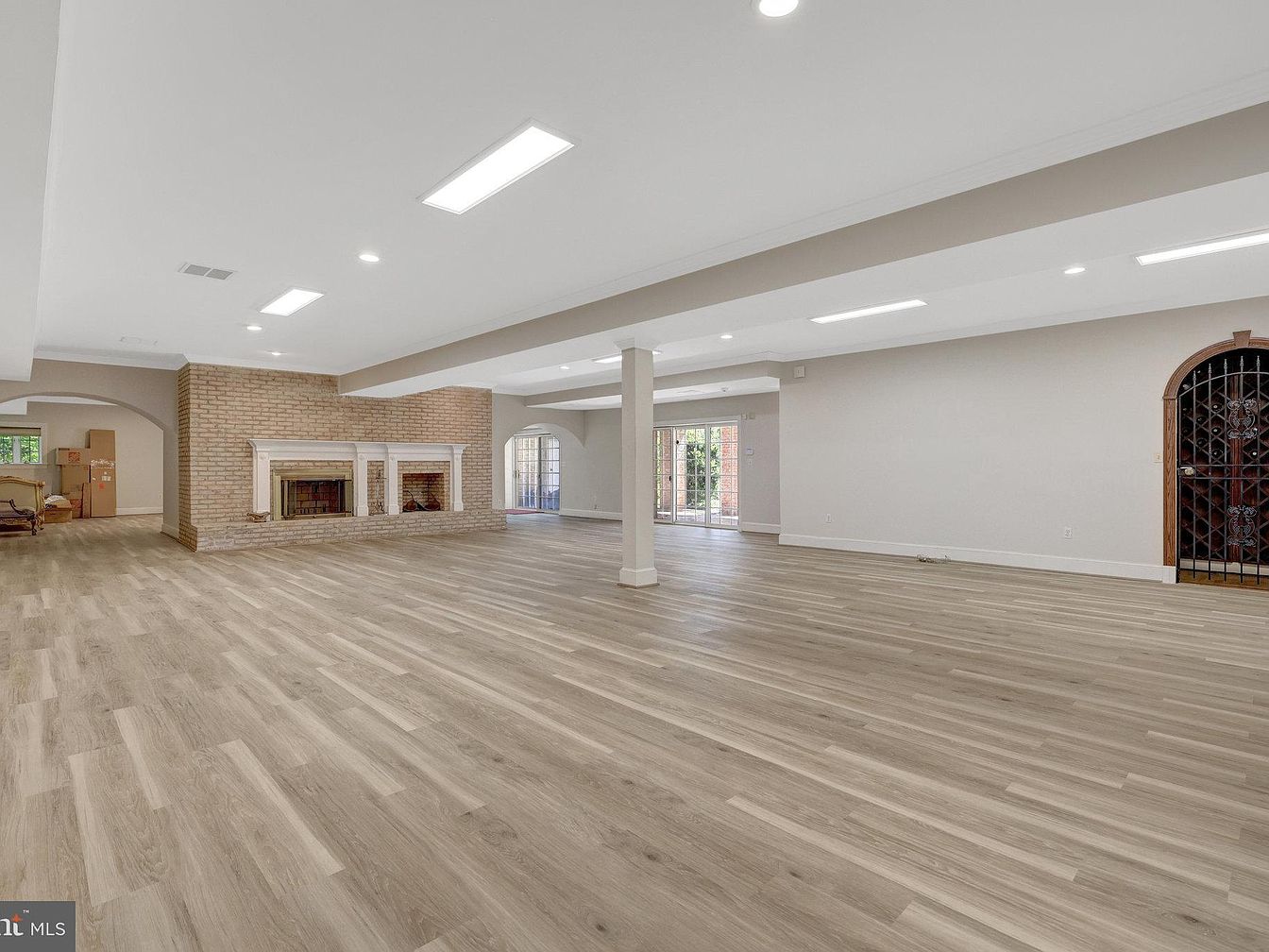 This generously sized basement features an open floor plan with light wood laminate flooring that adds warmth and continuity throughout the space. Its neutral walls and white ceiling with modern recessed and panel lighting keep the environment bright and airy. A central column subtly divides the area without obstructing flow. The room’s standout architectural element is a large double-sided brick fireplace with a classic white mantle, enhancing coziness and style. Arched doorways and a decorative wrought-iron gated alcove add character and charm, while multiple glass sliding doors provide natural light and outdoor connectivity.