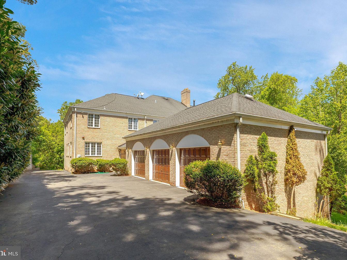 This spacious three-car garage features classic brown wooden doors set under elegant white arched frames, offering a refined traditional look. The light-colored brick exterior complements the muted gray shingled roof, harmonizing with the natural greenery around. The wide asphalt driveway provides ample space for easy vehicle access and parking. Surrounding landscaping includes neatly trimmed shrubs and small trees, enhancing curb appeal while maintaining a clean, orderly appearance. The home’s multiple windows and chimney hint at a large, well-constructed residence, blending functional outdoor utility with an inviting, timeless aesthetic.