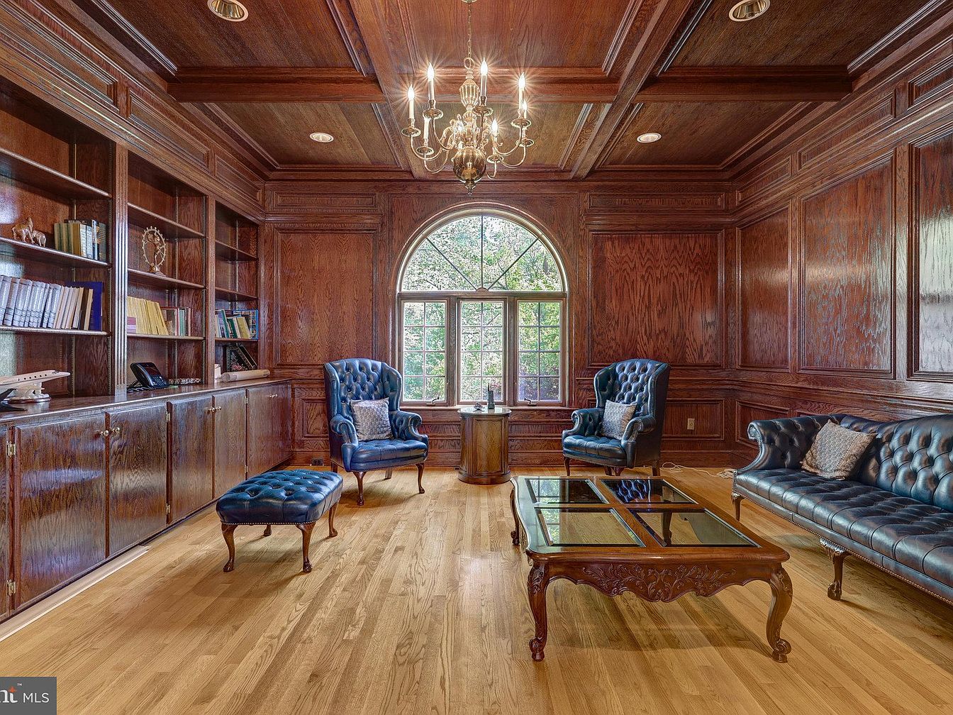 Rich wood paneling and built-in bookshelves envelop this refined home library, creating an atmosphere of classic elegance. The coffered ceiling with recessed lighting and a traditional chandelier highlights the room’s craftsmanship. A large arched window lets in natural light, balancing the warmth of the dark wood with a view of lush greenery outside. The seating arrangement features deep blue leather tufted chairs and a matching sofa, paired with an ornate wooden coffee table accented by glass panels. Hardwood floors add a natural tone that complements the traditional décor and sophisticated color palette.