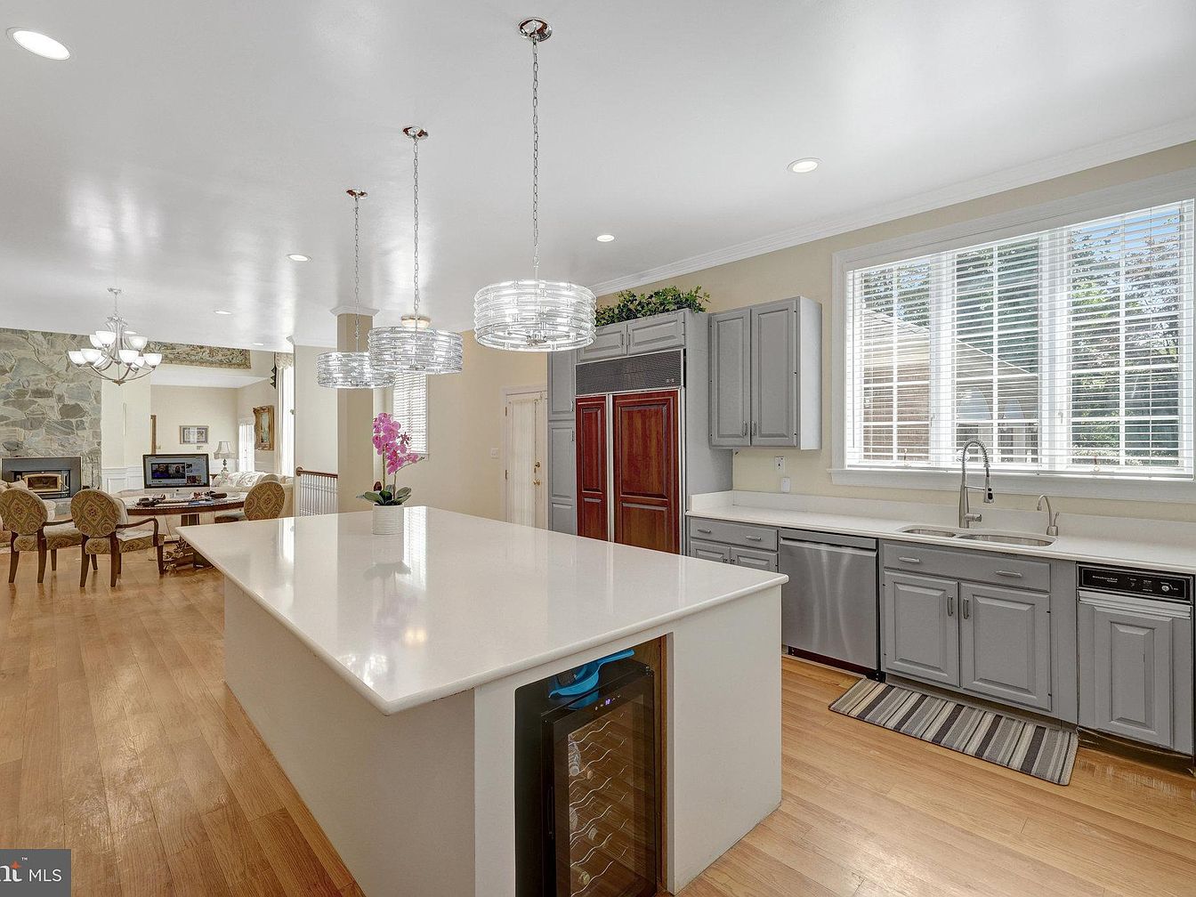 This spacious kitchen features a large, white quartz island with a built-in wine cooler, serving as a central focal point. Overhead, three distinctive pendant lights with glass detailing add elegance and modern charm. The cabinetry is painted in a soft gray tone, paired with stainless steel appliances, including a dishwasher and double-door refrigerator partially encased in matching cabinetry. Light hardwood floors provide warmth and continuity. Abundant natural light floods in through a wide window above the double sink, highlighting the open floor plan that flows seamlessly into the dining and living areas, where a stone fireplace creates a cozy atmosphere.