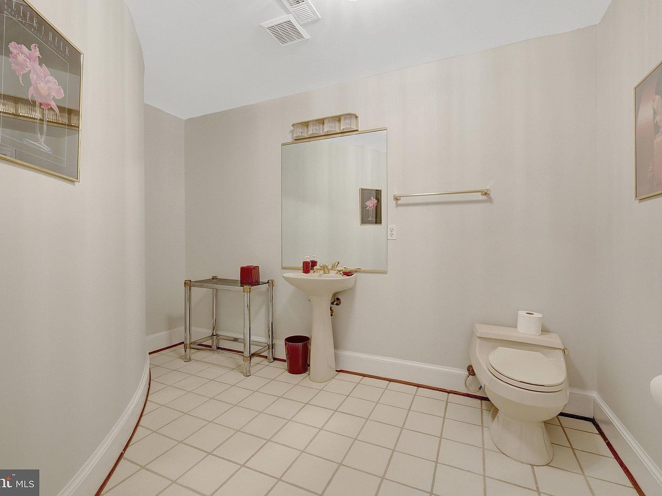 This powder room features a spacious layout with light beige walls that create a calming atmosphere. The floor is tiled in a creamy white grid pattern, bordered by a thin dark trim. A classic pedestal sink with brass fixtures sits beneath a large rectangular mirror, complemented by a simple brass light fixture above. The toilet is positioned neatly to the right with a matching light beige tone. A slim, transparent glass side table with metallic legs adds contrast on the left, accented by a red candle and wastebasket for a subtle pop of color. Soft artwork with pink floral imagery adorns the walls, enhancing the understated elegance of this functional space.