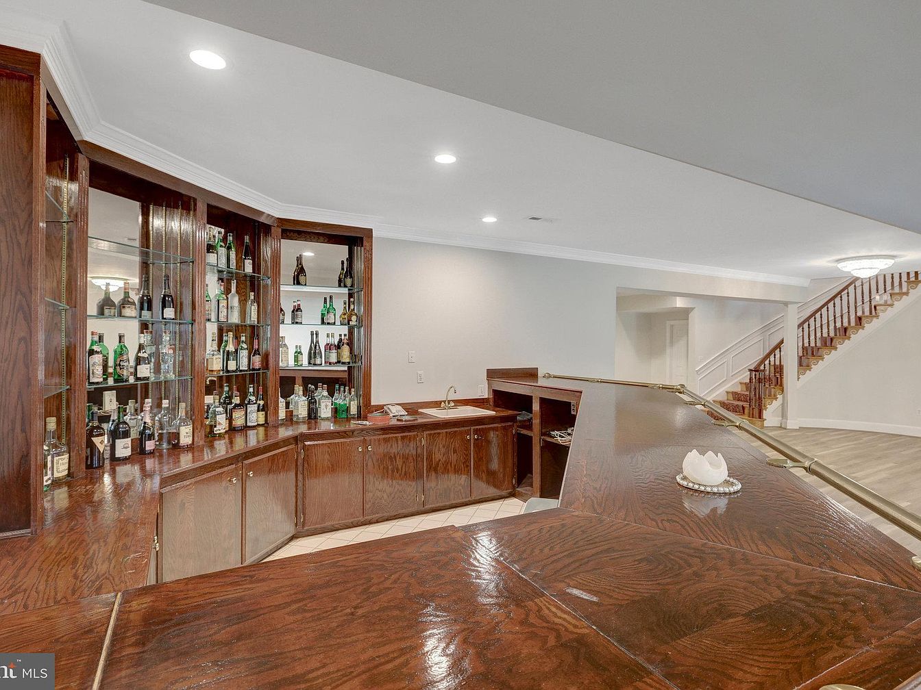 This home bar area features rich, dark wood cabinetry and a polished wood countertop that extends in an angular shape, creating a spacious serving and socializing surface. Behind the bar, multiple shelves with mirrored backing showcase an extensive collection of liquors and spirits, adding depth and elegance. The neutral grey walls and bright recessed lighting overhead provide a modern contrast to the classic wood tones. The layout includes a small sink area for convenience. Adjacent to the bar, a stairway with wooden handrails and white panel trim leads upstairs, blending traditional architectural details with functional space.