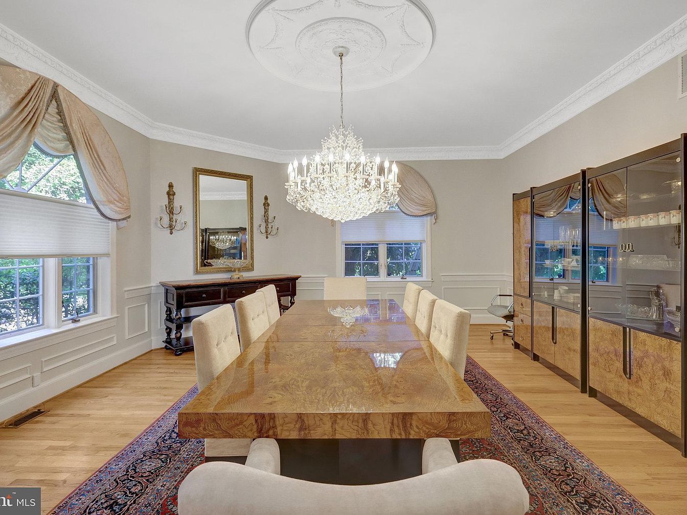 The formal dining room features a spacious layout centered around a large, glossy wooden dining table with a rich, burl wood finish that seats eight upholstered beige chairs, creating an inviting space for gatherings. The room’s elegant atmosphere is enhanced by an ornate crystal chandelier hanging from a ceiling medallion, casting a warm glow over the setup. Soft beige walls and detailed wainscoting complement the warm hardwood flooring and an oriental-style area rug underneath the table adds depth and texture. The large windows are dressed with softly draped, neutral-toned curtains that filter natural light, while a dark wooden console table with a gold-framed mirror and classic sconces provides balance and sophistication. On one side, a matching glass-front cabinet showcases fine glassware, reinforcing the room’s refined aesthetic.