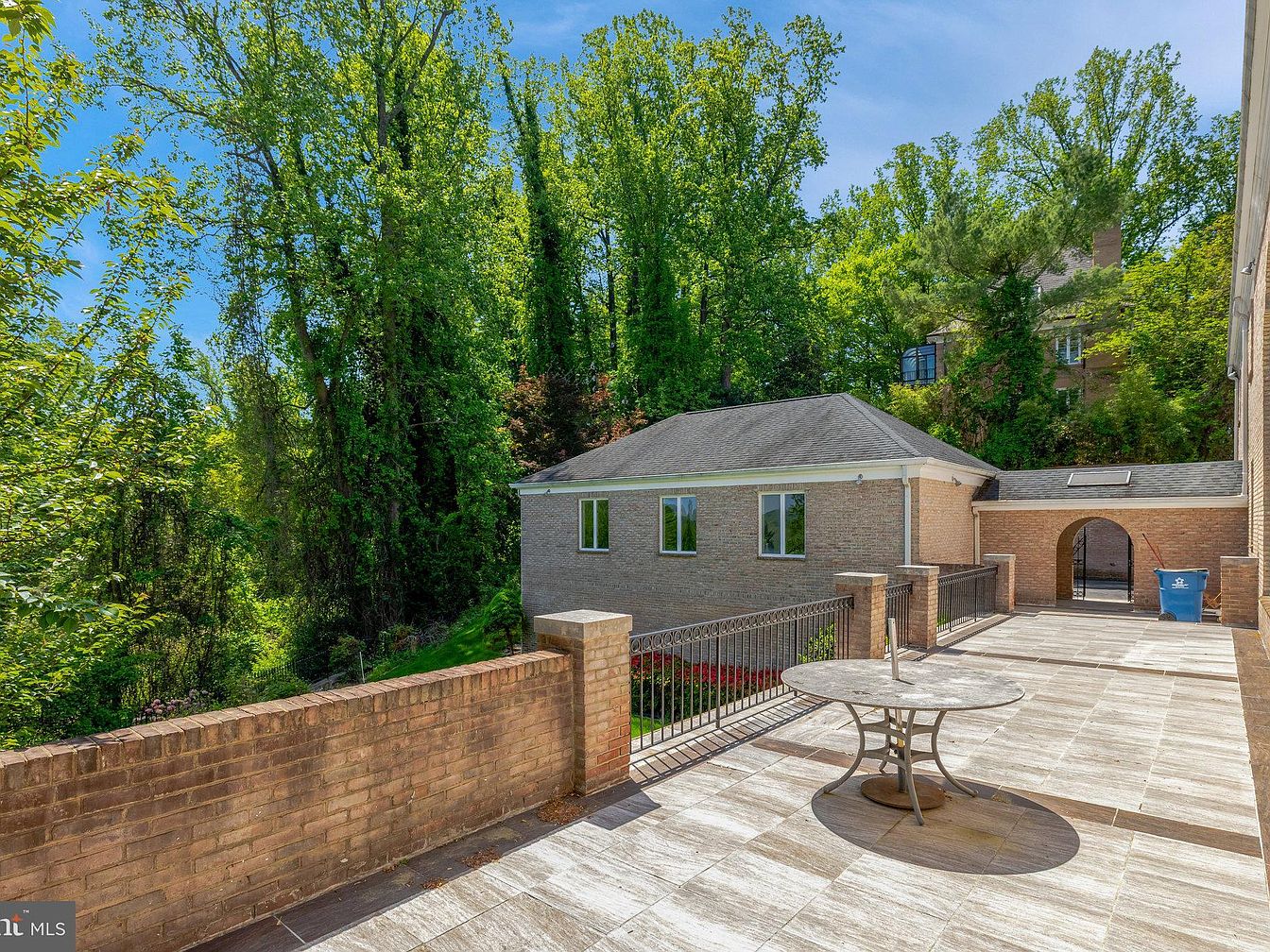 This spacious outdoor patio features a large tiled floor with a neutral tone that complements the surrounding brick walls. A circular metal table sits on one side, casting a bold shadow from the bright natural sunlight. The brick railing adds a rustic yet sturdy charm, enclosing the space and seamlessly connecting to the house through an arched doorway. The patio overlooks lush greenery with tall trees and shrubs, creating a serene and private ambiance. The adjacent building with multiple windows hints at additional living or guest quarters, accentuating the sense of openness and tranquility.