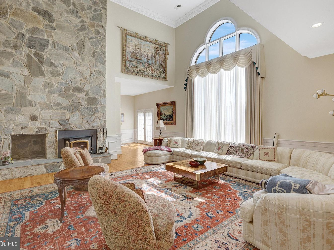 This spacious living room features a tall vaulted ceiling and a striking stone fireplace that extends from floor to ceiling, creating a rustic focal point. A large arched window with sheer drapes allows natural light to wash over the soft beige walls. The seating area consists of an off-white sectional adorned with a variety of embroidered cushions, paired with two curved armchairs in a muted paisley fabric. A richly patterned, warm-toned area rug anchors the space beneath a modern, square coffee table with a polished wood finish. Classic artwork and elegant drapery complete the inviting ambiance.