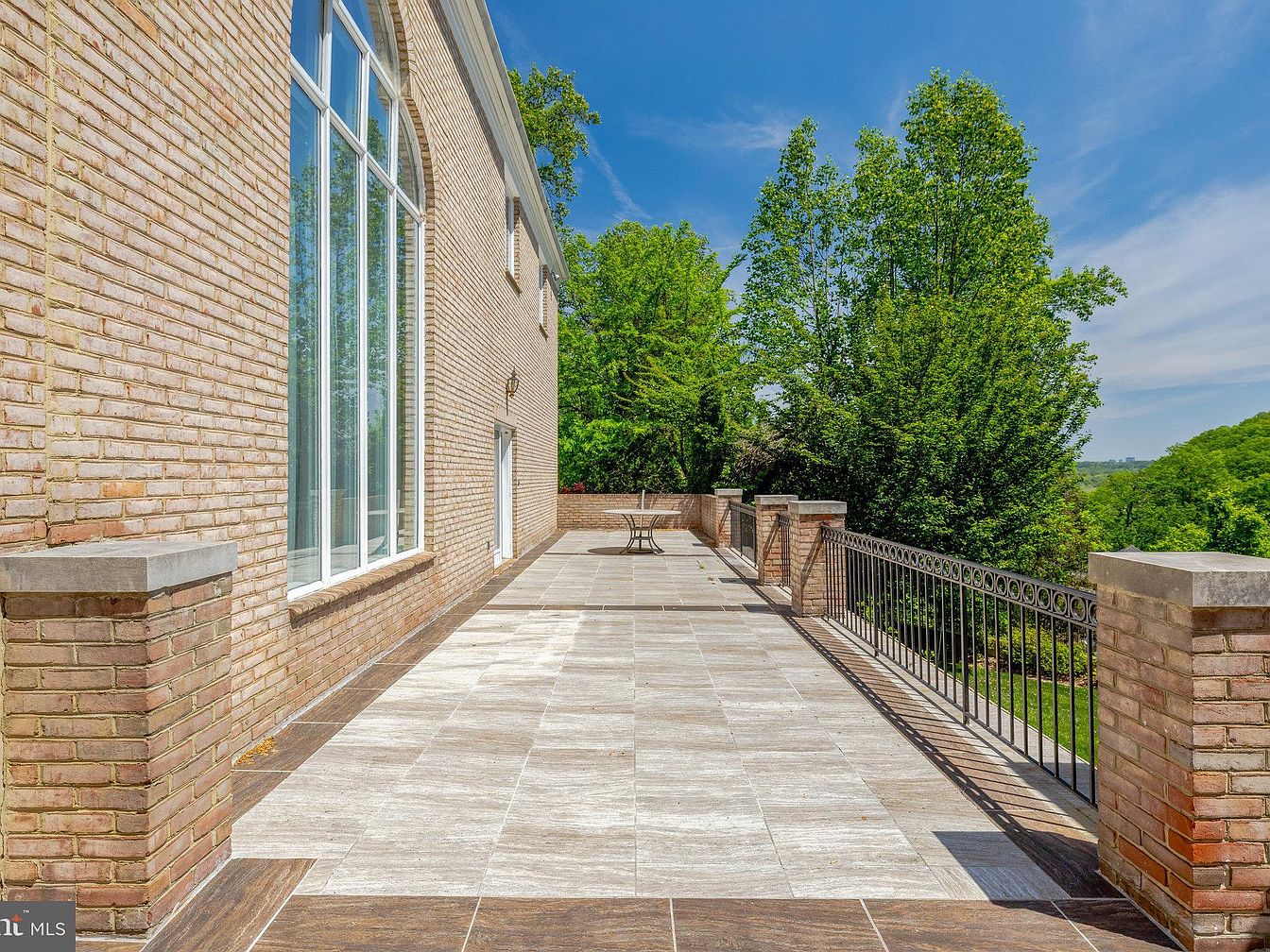 This expansive outdoor patio features large rectangular tiles in neutral shades of beige and brown, lending a contemporary yet natural look. The space is bordered by brick pillars and a black wrought-iron railing, adding structure and safety while maintaining an open feel. The adjacent house exterior displays light-colored brick with tall, arched windows, inviting ample natural light inside. Lush green trees surround the patio, offering a serene view and privacy. A small, round metal table is the sole furnishing, highlighting the openness and versatility for outdoor relaxation or entertaining.