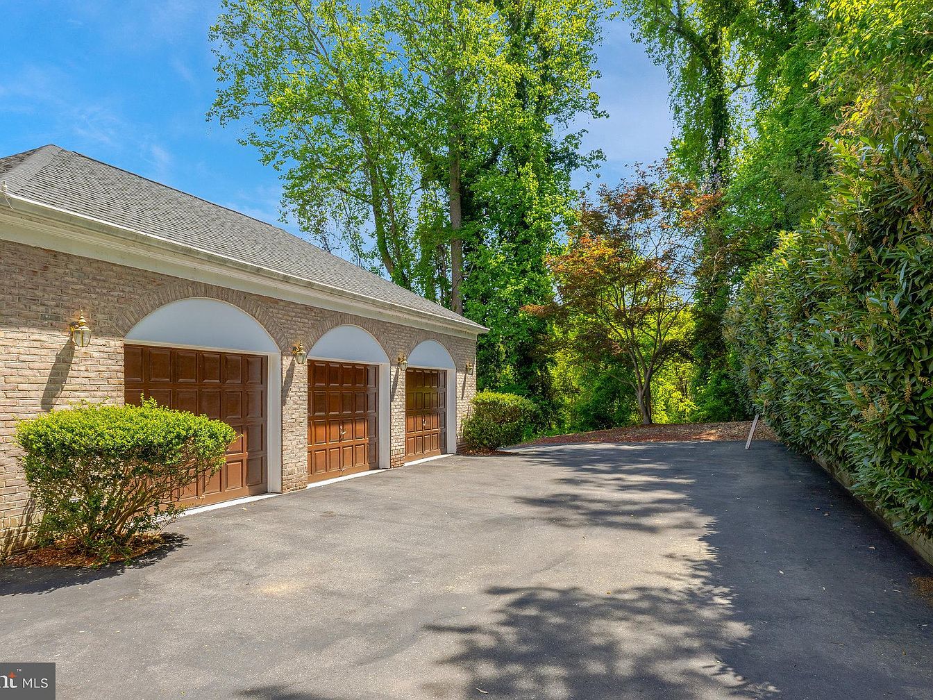 This outdoor space features a three-car garage with stylish brown wooden doors, each framed by white arches and separated by light brick walls, adding a classic architectural touch. The paved driveway extends in front of the garage, offering ample parking space and a smooth surface devoid of clutter. Flanking the driveway on the right side is a tall, dense hedge providing privacy and lush greenery, while the left side features neatly trimmed bushes. Mature trees rise beyond, their green foliage contrasting vividly against the blue sky, creating a serene and inviting exterior atmosphere.