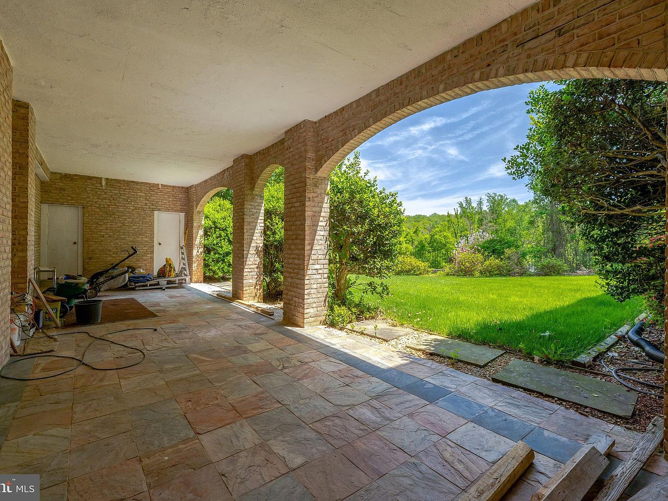 This spacious covered patio features a tiled floor in muted earth tones that complement the warm brick walls and arched openings. The ceiling is flat and painted white, creating a clean contrast with the textured brick pillars that frame the patio and provide a clear view of the lush green backyard. Two white doors at the far end likely lead to storage or utility spaces. The area is partially used for garden equipment storage. The patio’s open arches and natural surroundings combine to evoke a peaceful outdoor living experience with ample shade and sunlight balance.