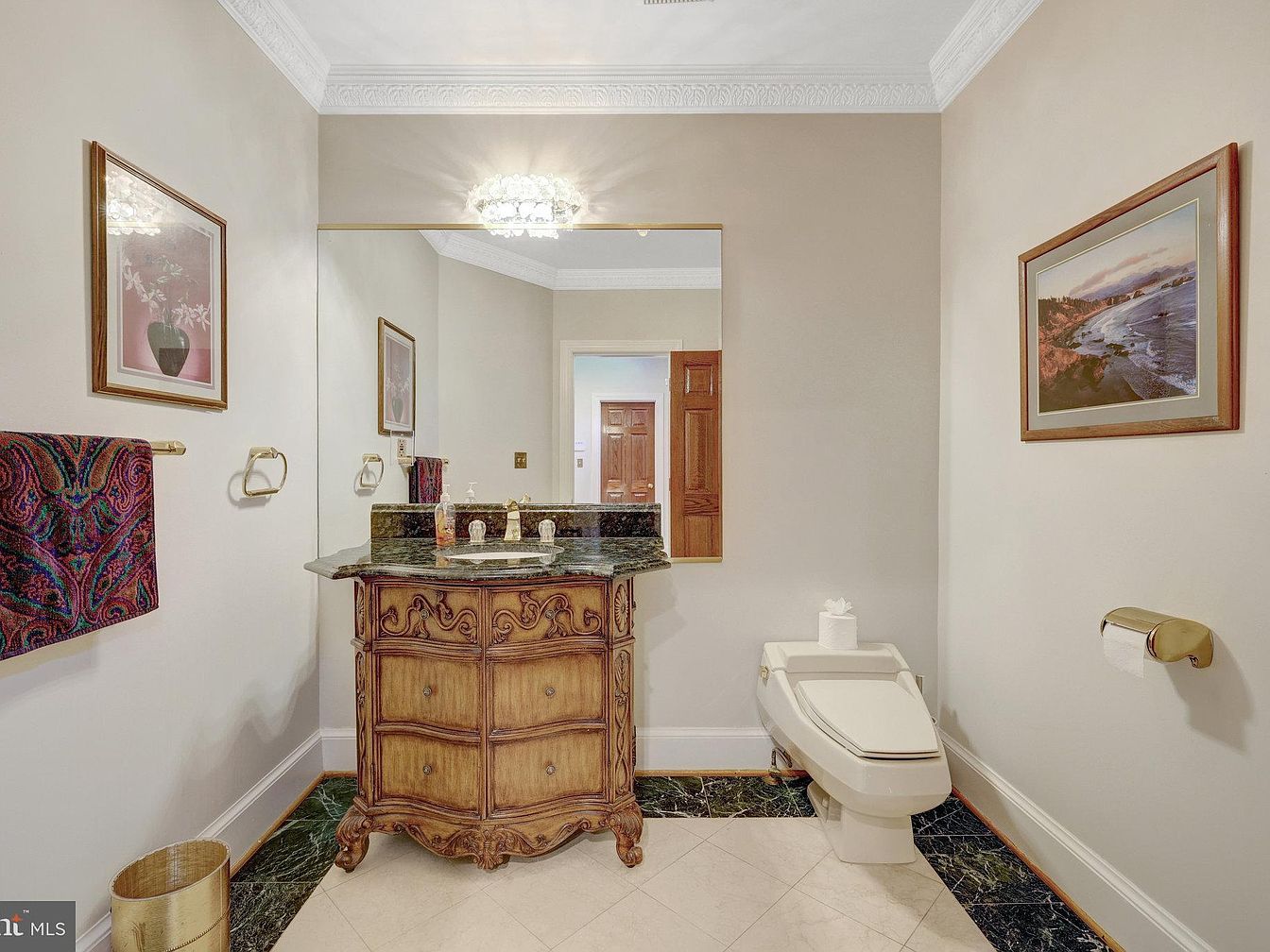 This powder room features an elegant combination of traditional and classic styles within a compact layout. The focal point is an ornately carved wooden vanity with a dark green marble countertop and a matching backsplash, creating a rich contrast against the soft beige walls. Above the vanity, a large, simple rectangular mirror enhances the space’s openness and reflects the intricate crown molding on the ceiling, adding architectural sophistication. The flooring combines cream tiles bordered by green marble accents, complementing the vanity top. Brass fixtures, including the towel holder and toilet paper holder, add a warm, vintage touch. Framed artwork on either side brings color and personality, while a patterned towel injects subtle vibrancy, balancing functionality and style in this refined powder room.