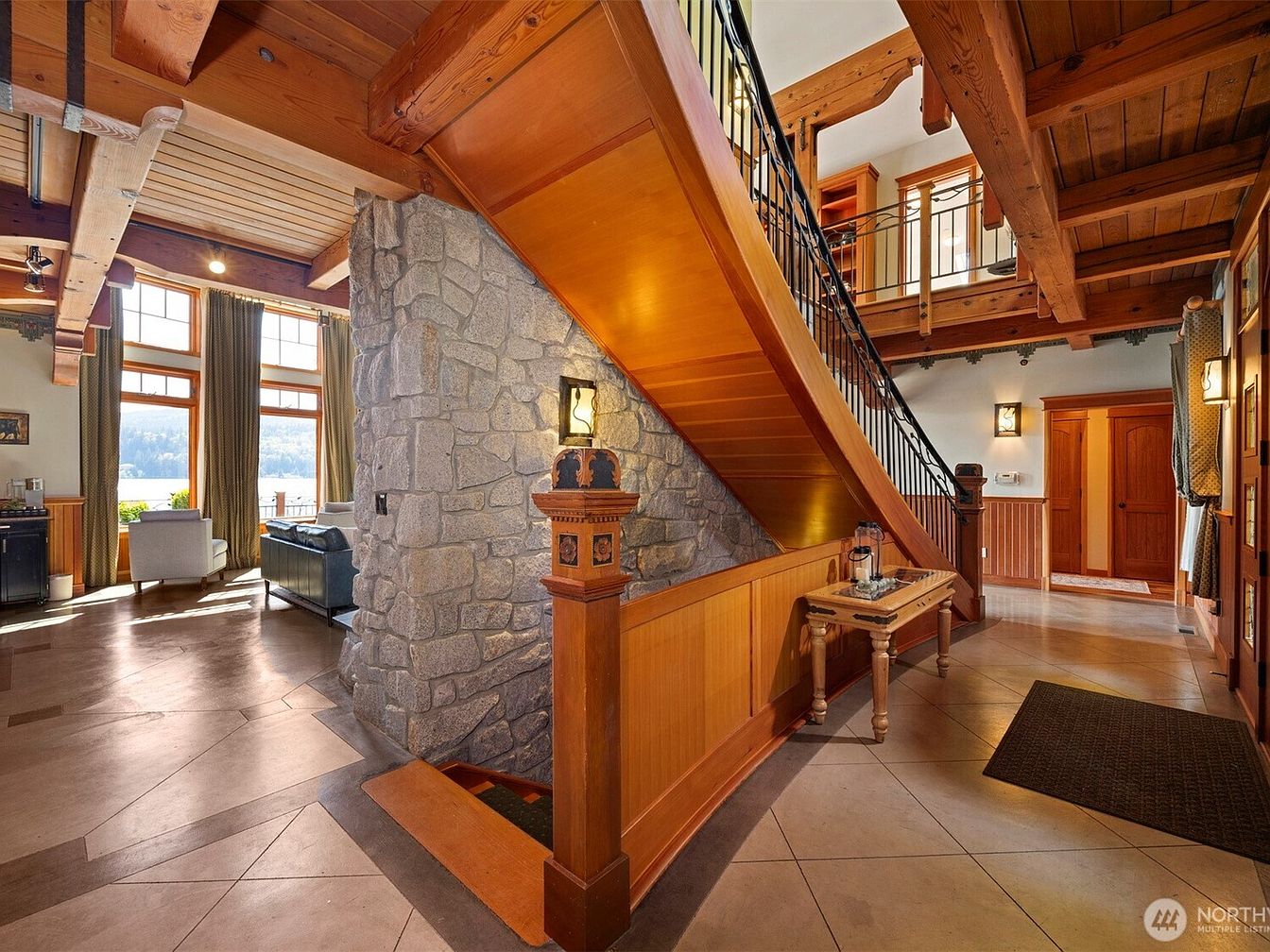 The entryway features a warm, inviting blend of natural stone and rich wood finishes. A striking stone wall anchors the space beneath a sturdy wooden staircase with smooth, polished treads and wrought iron railings that add a subtle decorative touch. The floor is laid with large, light-toned tiles arranged in a diagonal pattern, complementing the wood paneling that lines the lower walls. Soft, natural light filters through tall windows in the adjacent living area, highlighting the exposed wooden beams on the ceiling and lending a cozy, rustic atmosphere. A small wooden console table rests against the stair railing, enhancing the functional elegance of this welcoming foyer.