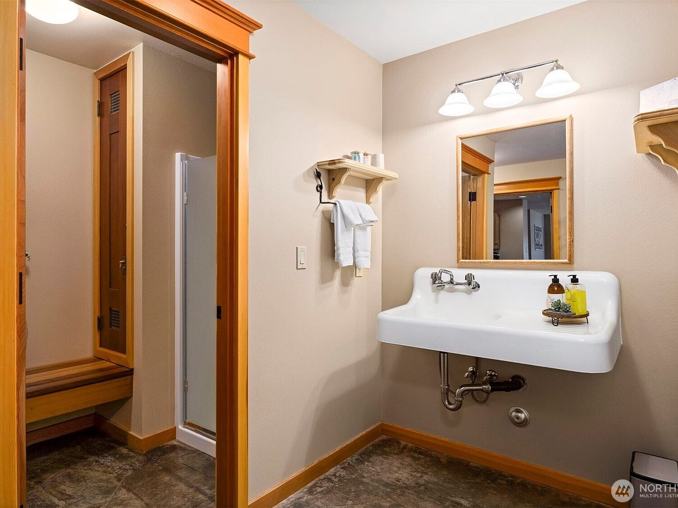 This compact bathroom area features a vintage-style white porcelain wall-mounted sink with exposed plumbing, blending retro charm with functionality. Above the sink, a simple rectangular mirror framed in wood complements the warm wood trim around the doorway and baseboard, creating cohesive natural tones. The walls are painted in a soft beige, adding warmth without overwhelming the space. A practical wooden shelf with white corbels holds toiletries and a towel rack below it keeps fresh white towels within easy reach, while the polished floor contrasts subtly with the wood details. The partially visible shower area, enclosed with a glass door, enhances the room’s efficient layout and modern convenience.