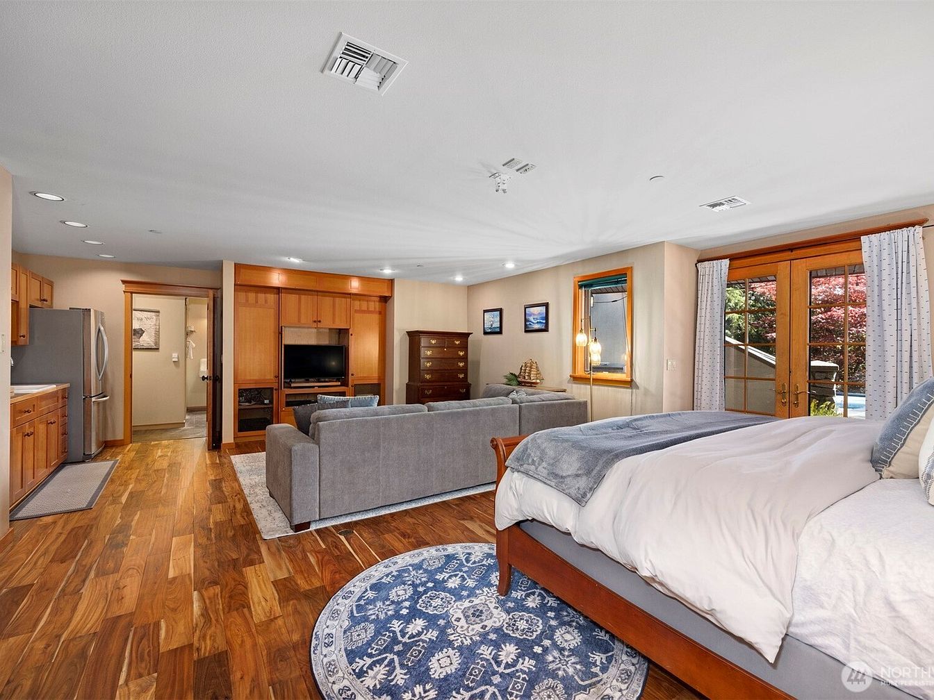 This spacious master bedroom integrates a cozy living area and kitchenette, creating a multifunctional retreat. Warm wood flooring and matching cabinetry contrast with neutral beige walls, lending a natural and inviting ambiance. The wooden bed frame is complemented by white and gray bedding, accented with a plush blue throw and coordinating pillows. A round blue patterned rug beneath the bed area adds texture and visual interest. The gray sectional sofa faces a built-in wooden entertainment center housing a TV. French doors with curtains open up to an outdoor space, enhancing the room’s light and airy feel. Subtle recessed lighting and two framed wall art pieces complete the look.