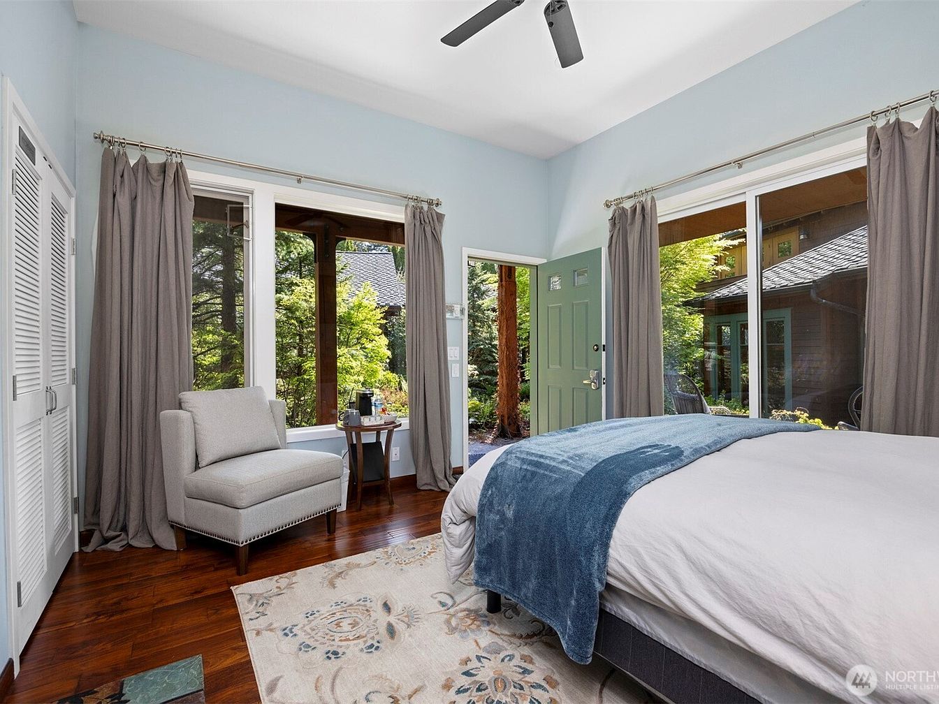 This cozy bedroom showcases a serene palette with soft blue walls contrasted by rich, dark hardwood floors. Natural light floods the room through large windows adorned with long taupe curtains, enhancing the connection to the lush outdoor greenery. A plush, light beige armchair sits invitingly next to a small, dark wood side table with a coffee setup, creating a quiet reading nook. The bed is dressed in crisp white linens with a textured blue throw adding a pop of color and warmth. A patterned area rug anchors the space while the mint-green front door adds a subtle vintage charm.