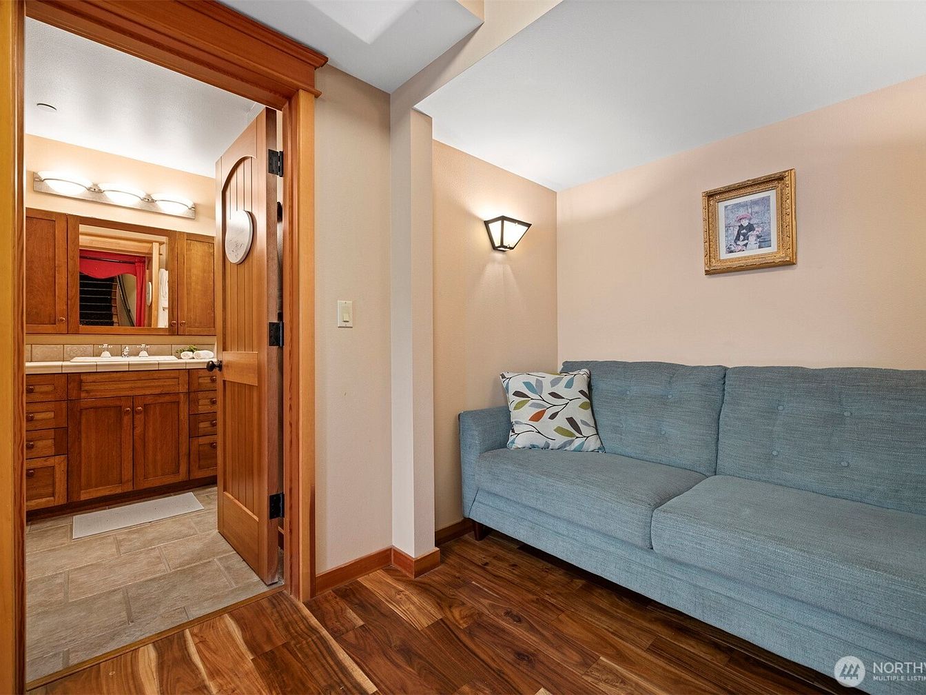 This intimate corner serves as a cozy sitting area beside a bathroom, distinguished by warm, earthy tones. Light tan walls provide a soft backdrop for the muted teal sofa, which features button tufting and a decorative pillow with a modern leaf pattern that adds a touch of visual interest. The rich, natural wood floor contrasts beautifully with the blue upholstery, while matching wooden trim and door frame enhance a cohesive feel. The bathroom features rustic wooden cabinetry and a white countertop, illuminated by sleek, modern light fixtures, blending practicality with a welcoming ambiance seamless between the two spaces.
