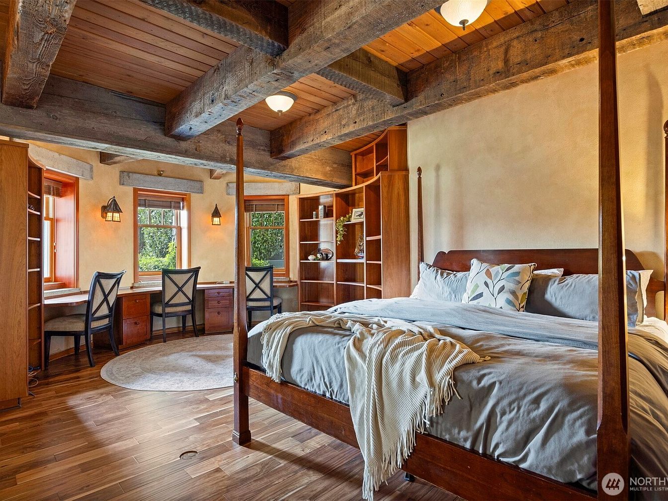 This master bedroom combines rustic charm with functional elegance, featuring exposed wooden ceiling beams that add warmth and character. A large four-poster bed with rich wood tones anchors the room, softened by light gray bedding and a cozy throw. The opposite wall houses a built-in curved wooden desk and shelving area under three windows, inviting natural light for work or reading. Black wooden chairs contrast with the wood hues, while the cream-colored walls and matching round rug create a calm, inviting atmosphere. The sconce lighting complements the natural and warm textures throughout.