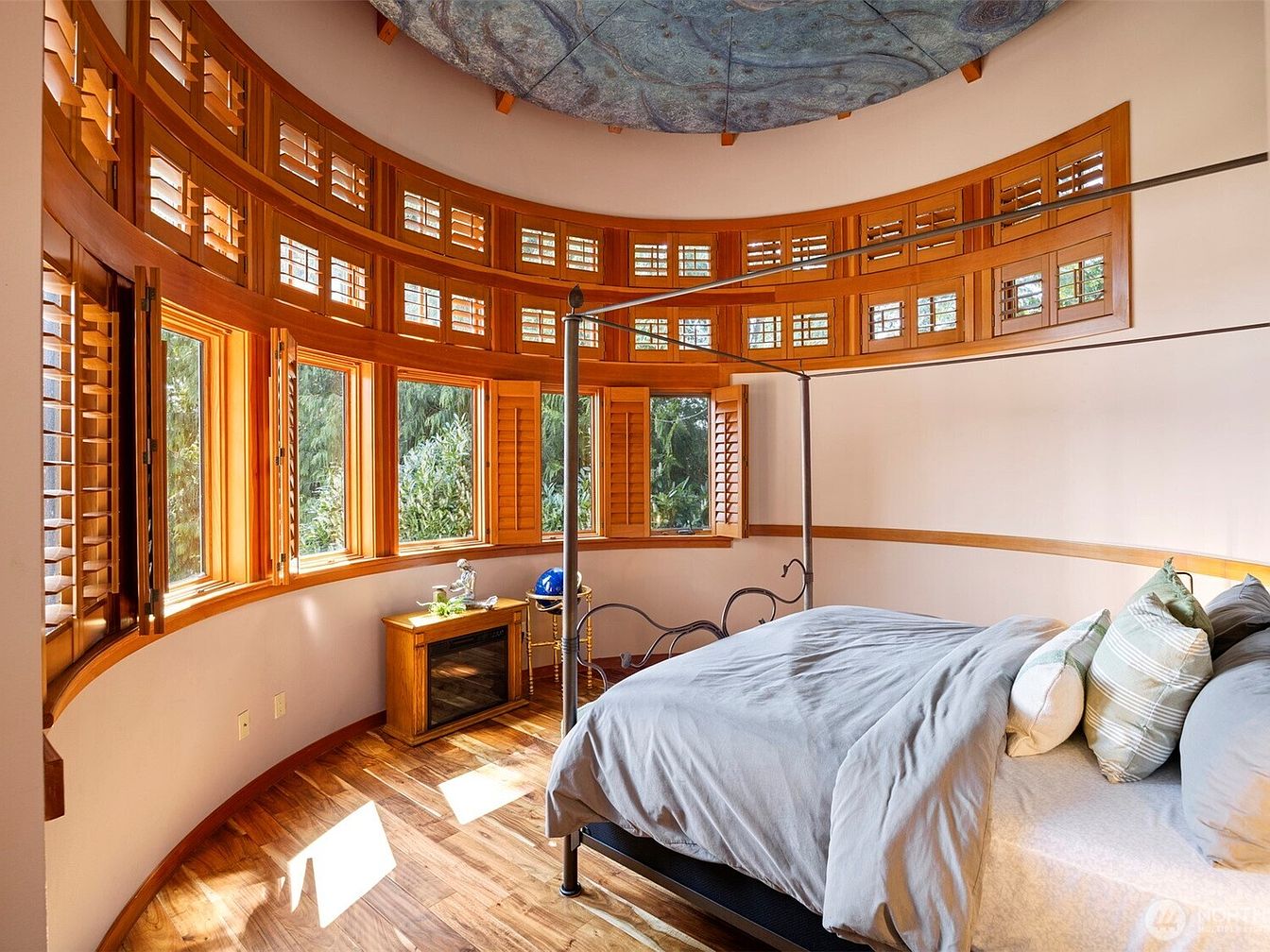 This bedroom features a striking curved wall lined with two levels of large wooden-framed windows, showcasing rich natural wood tones that contrast beautifully with the crisp white walls. The windows are accented by elegant shutters, allowing filtered light to brighten the space while offering privacy and an organic, warm ambiance. The polished wood flooring enhances the warm aesthetic, harmonizing with the window trim and baseboards. A minimalist, black metal four-poster bed with soft, neutral bedding sits adjacent to a small vintage-style electric fireplace and a brass globe bar cart, blending rustic charm with contemporary comfort. Above, the ceiling’s artistic circular design adds subtle drama and texture to the serene, nature-inspired retreat.