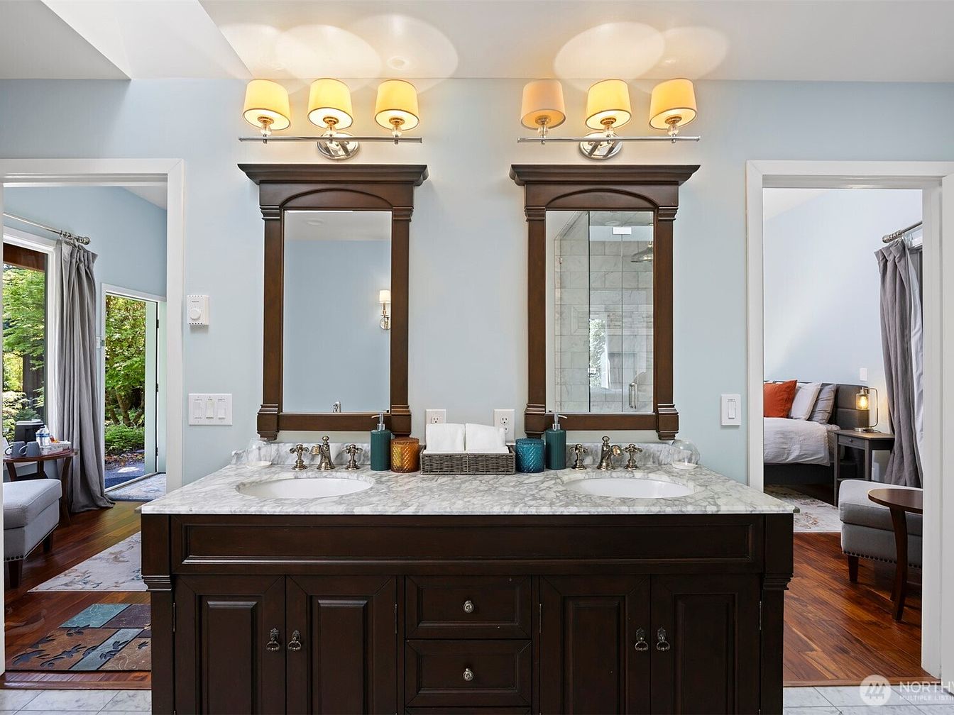 This bathroom features a classic double vanity with rich dark wood cabinetry contrasted by a polished marble countertop. Two large, framed mirrors with traditional detailing anchor the space, each illuminated by elegant four-light sconces mounted above. The soft blue walls add a serene, calming atmosphere while connecting visually to adjacent rooms visible through open doorways. The flooring appears to be a bright tile that complements the countertop. Small decorative items like soap dispensers and a wicker basket with towels provide both function and subtle pops of color, enhancing the overall timeless design.