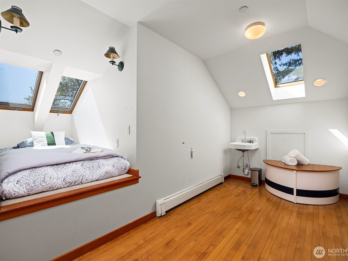 This serene attic bedroom features a minimalist design with light gray walls and warm honey-toned hardwood floors. Two skylights bathe the space in natural light, enhancing the airy feel of the sloped ceiling. A built-in nook accommodates a cozy bed layered with patterned white and gray bedding, complemented by a decorative green-striped pillow. Black and brass wall sconces add a touch of vintage elegance. Towards the back, a compact white sink and a folded wooden bench with a soft rounded top and neatly rolled towels suggest a practical, yet calming finish to this intimate sleeping area.