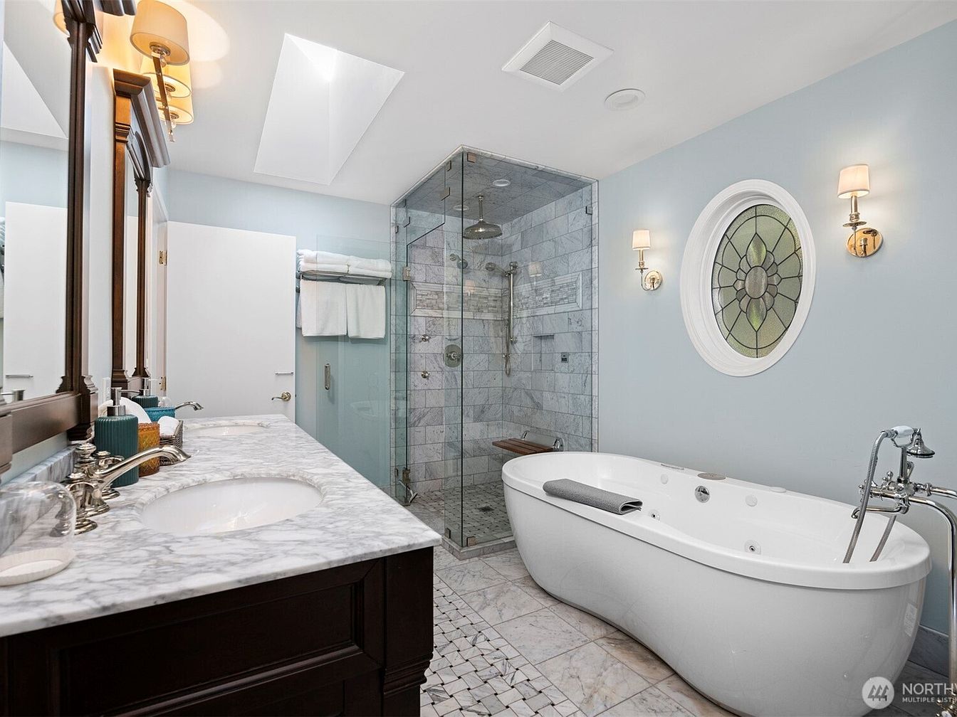 This bathroom exudes a serene, spa-like atmosphere with its soft blue walls and elegant marble accents. The spacious layout features a freestanding white soaking tub equipped with a chrome faucet and handheld shower. Adjacent is a walk-in shower enclosed in clear glass, lined with marble tiles and finished with a built-in bench and multiple showerheads. A double vanity with a dark wood base and marble countertop offers ample space beneath two large framed mirrors. Warm wall sconces flanking a decorative round window add sophisticated charm, while the mosaic marble floor ties the look together with timeless luxury.