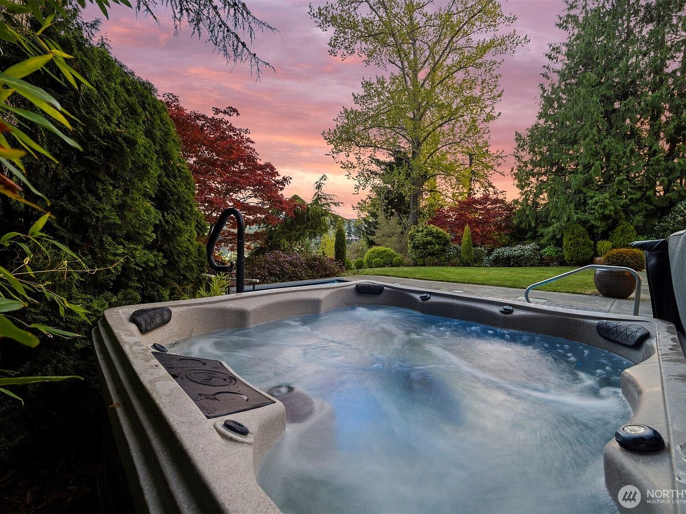This tranquil outdoor space features a spacious hot tub surrounded by lush greenery, including tall evergreens and vibrant red-leafed trees, creating a private and serene atmosphere. The bubbling water within the tub invites relaxation, while the smooth stone or concrete patio provides a clean, modern base. Beyond the hot tub, a well-manicured lawn and diverse shrubs add texture and depth to the garden. The sky transitions into soft pink and purple hues of dusk, enhancing the peaceful and inviting ambiance of this backyard retreat designed for unwinding and enjoying nature.