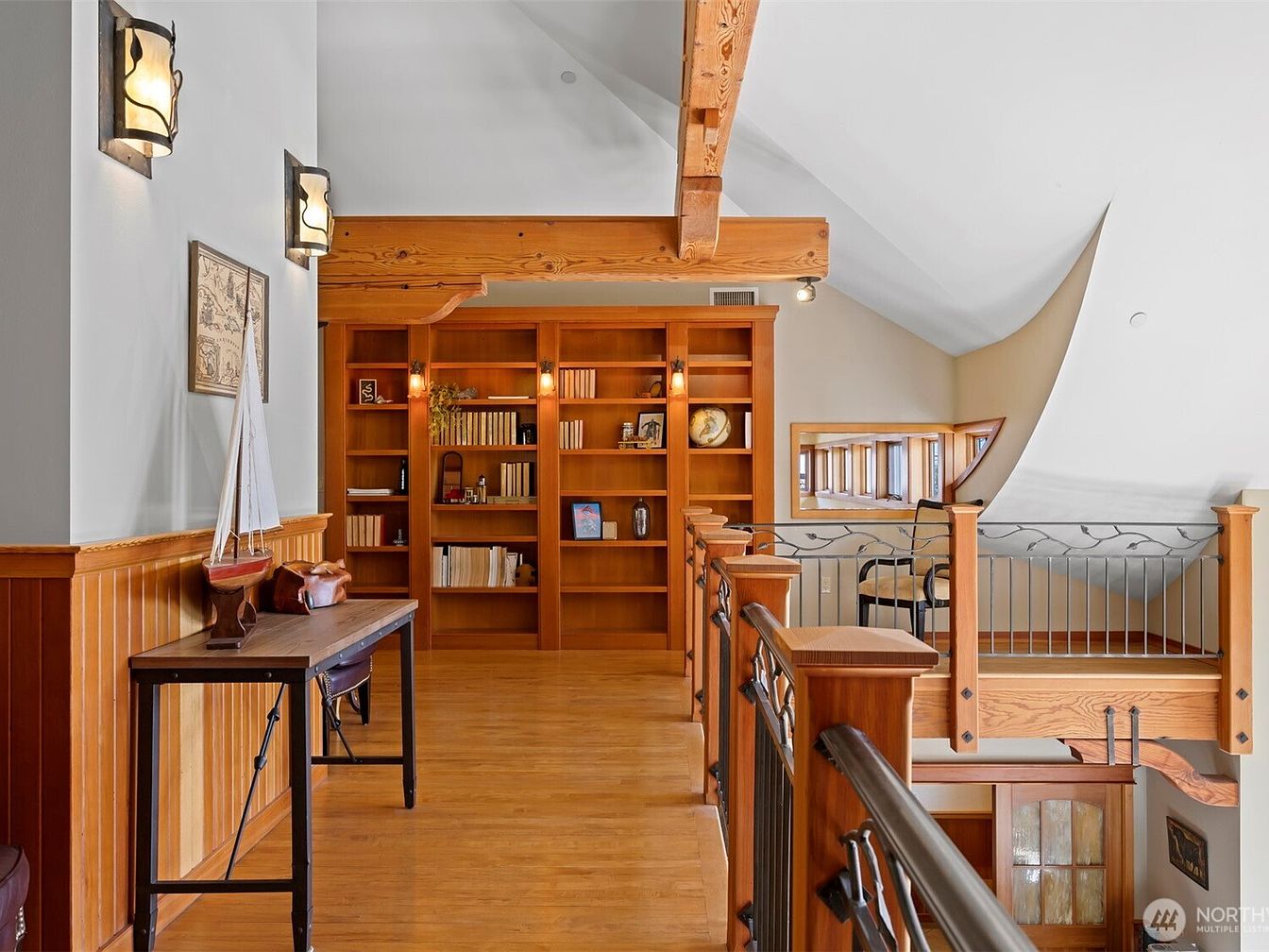 This warmly lit upper hallway integrates natural wood elements prominently. A large built-in wooden bookshelf filled with neutral-toned books anchors the far wall, highlighted by subtle wall-mounted lamps. Exposed wooden beams with rich grain cross the white ceiling, enhancing a rustic yet polished atmosphere. Along one side, wood paneling covers the lower wall next to a sleek, industrial-style console table adorned with a sailboat model and decorative items. The opposite side features a protective railing with vertical black metal spindles and wooden posts, blending safety with style. The soft, neutral wall colors complement the honey-hued hardwood floor beautifully, creating a cozy yet open transitional space.