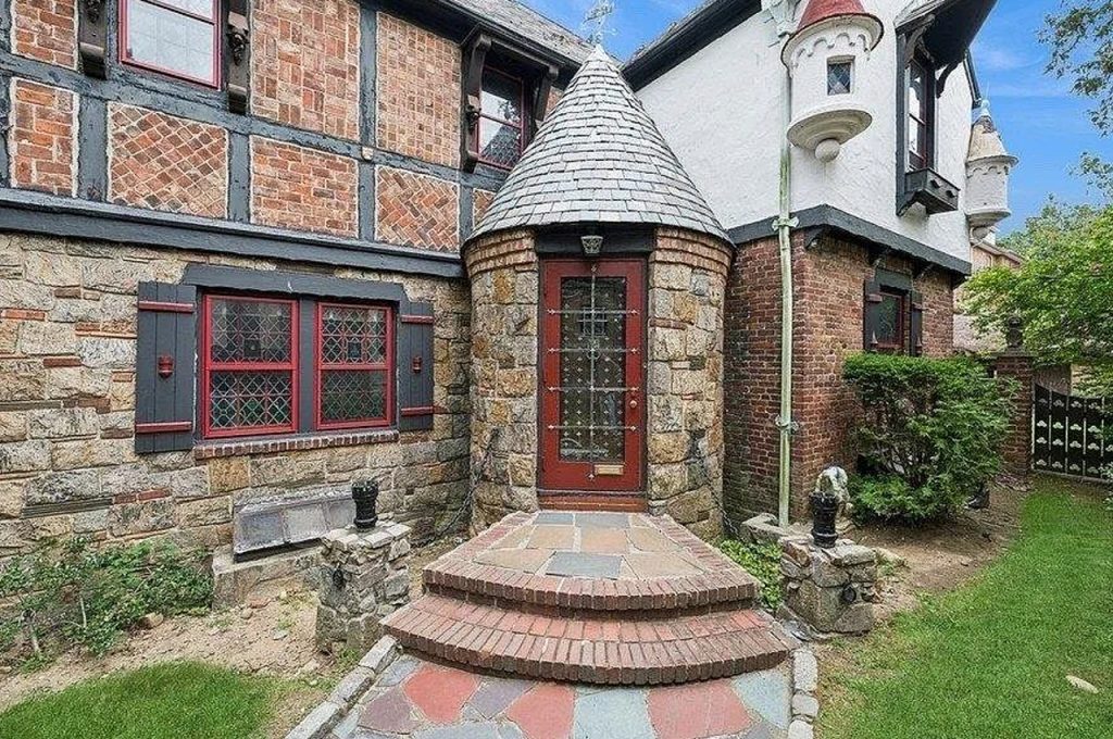 This storybook-style entrance is a true architectural gem, featuring a charming turret entryway clad in rustic stone with a conical slate roof. The arched glass-paneled door, framed by brick detailing, creates a warm yet regal welcome. A winding brick-and-flagstone staircase adds to the Old-World charm, guiding visitors into a home that feels straight out of a medieval fairytale. The Tudor-style façade, with half-timbered details, red brickwork, and leaded glass windows, enhances the home’s historical character, while whimsical turret accents further elevate its enchanting curb appeal.