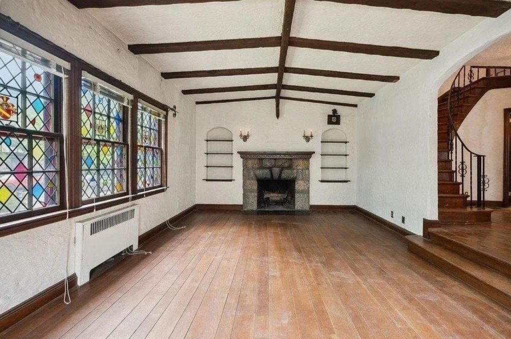 This charming family room exudes warmth, featuring a beamed ceiling and textured white walls that enhance its storybook character. The stone fireplace serves as a cozy focal point, framed by built-in arched alcoves with floating shelves that add functional charm. Sunlight filters through the stained-glass windows, casting colorful reflections across the rich hardwood flooring. A gracefully curved iron-railed staircase in the background adds a dramatic architectural touch, leading to the upper level while maintaining the home’s fairytale appeal.