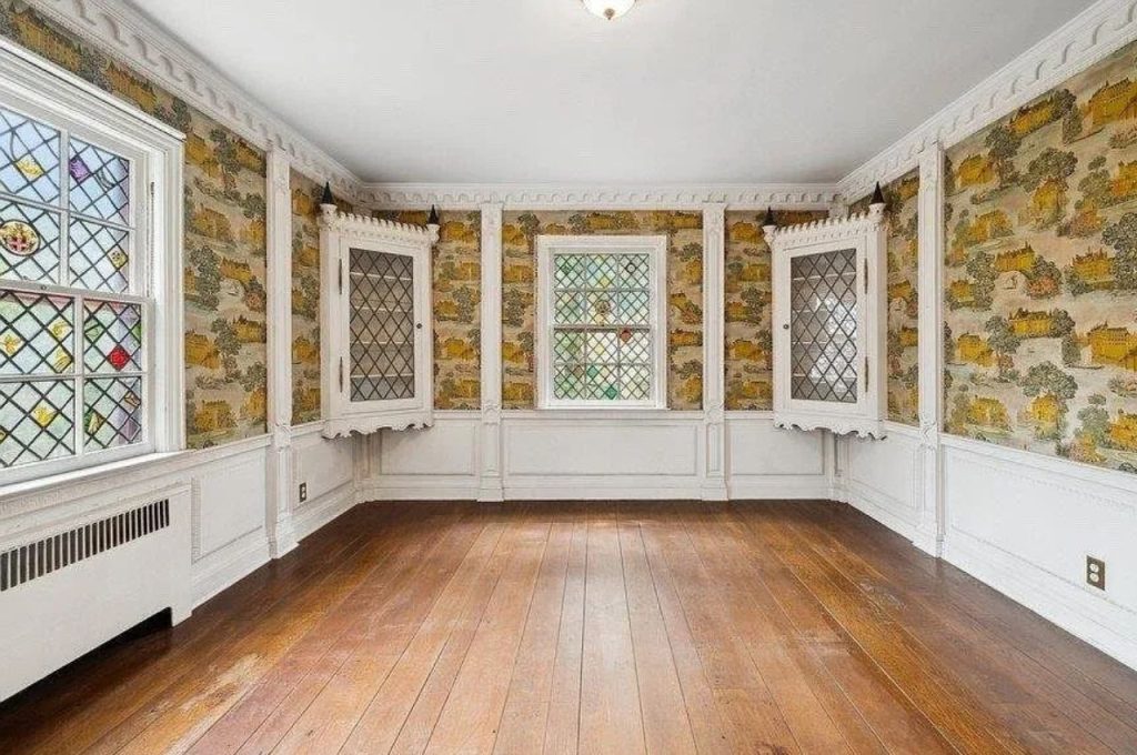 This living room blends historical charm with distinctive architectural details. The leaded glass windows add a touch of vintage artistry, casting colorful light across the space. Ornate built-in corner cabinets with intricate woodwork provide both storage and character, enhancing the room’s stately appeal. The rich hardwood flooring contrasts beautifully with the wainscoting and crown molding, while the pastoral-themed wallpaper brings a sense of warmth and nostalgia. This space is perfect for those who appreciate timeless design with a story to tell.