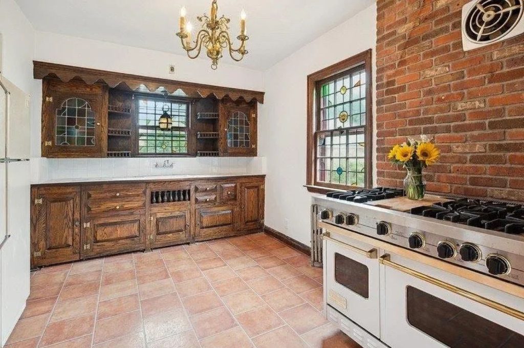This inviting kitchen seamlessly blends old-world character with functional design. Warm terracotta floor tiles complement the rich oak cabinetry, which features intricate glass detailing and scalloped trim. A striking exposed brick wall adds texture and warmth, housing a professional-grade vintage stove with double ovens and brass accents. The leaded glass windows filter in soft, colorful light, enhancing the cozy ambiance. A brass chandelier completes the space, adding a touch of elegance. This kitchen is a perfect balance of rustic charm and timeless appeal.