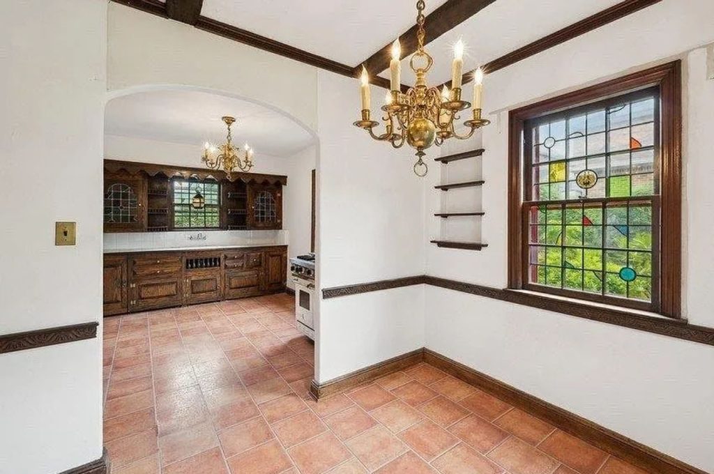 This charming dining room effortlessly complements the adjoining kitchen, creating a warm and inviting atmosphere. Terracotta tiles flow seamlessly between the spaces, while dark wood trim and beams add a rich contrast against the crisp white walls. A brass chandelier enhances the classic elegance, casting a soft glow over the space. The leaded glass window, adorned with colorful stained accents, brings in natural light and a touch of vintage artistry. Open shelving provides an opportunity for stylish displays, making this dining area both functional and full of character.