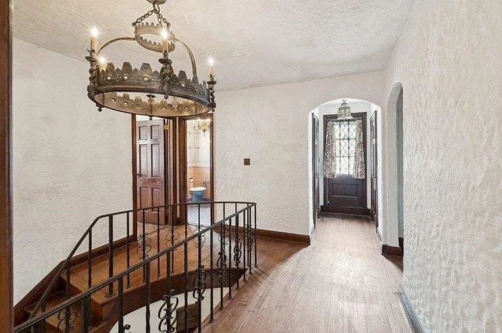 This upstairs landing is a stunning blend of character and craftsmanship, featuring rich wood flooring, textured plaster walls, and graceful arched doorways. A wrought iron railing adds an artistic touch, framing the staircase while maintaining an open feel. The standout feature is the medieval-style chandelier, which casts warm, ambient light and enhances the home’s historic charm. At the far end, a leaded glass door with delicate drapery allows natural light to filter through, creating an inviting atmosphere. Every detail in this space speaks to timeless elegance and thoughtful design.