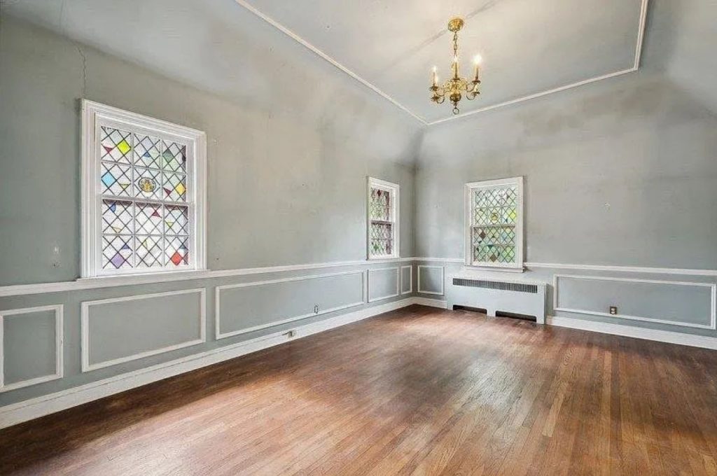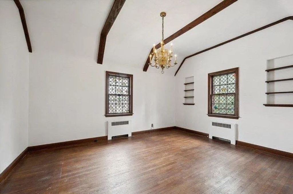 This spacious bedroom exudes old-world charm with its soaring vaulted ceiling and intricate wainscoting. Soft gray walls set a serene tone, beautifully complemented by the warmth of the hardwood floors. The true focal points are the stained-glass windows, which add a touch of whimsy and color while allowing natural light to filter in gently. A vintage brass chandelier enhances the room’s historic appeal, creating a refined yet inviting atmosphere. With its graceful architectural details and ample space, this bedroom is a canvas ready for personal touches.