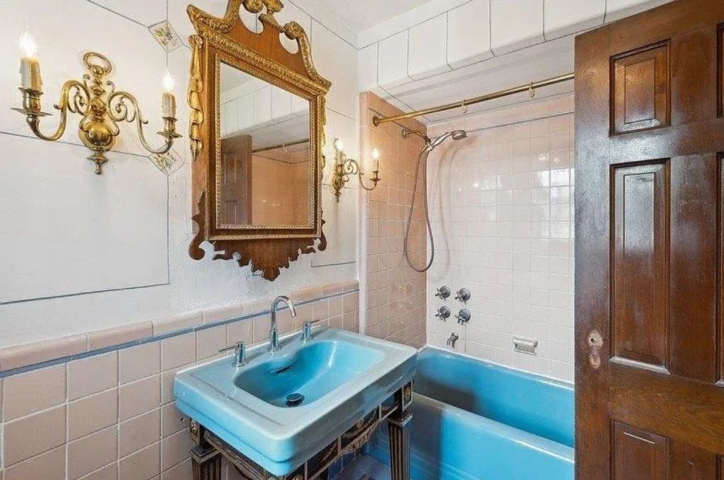 This bathroom is a striking blend of vintage elegance and bold character. The standout feature is the vibrant blue porcelain sink and matching bathtub, adding a pop of color against the soft pink wall tiles. An ornate gilded mirror serves as a statement piece, complemented by intricate brass sconces that cast a warm glow. The delicate hand-painted tile accents add an artisanal touch, enhancing the old-world charm. A brass shower rod and classic fixtures complete the look, preserving the space’s historical integrity. With its mix of antique detailing and rich textures, this bathroom exudes a timeless, European-inspired allure.